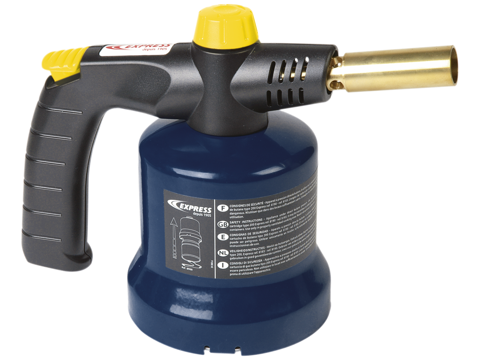 Blæselampe med Piezotænding, ergonomisk håndtag og metalklokke til beskyttelse af gasbeholderen. Forbrug 110g/time. Kapacitet 1,5kW. Flamme ø6×60 mm. Brænder ø16 mm. Maks. temp. ca. 1.800°.