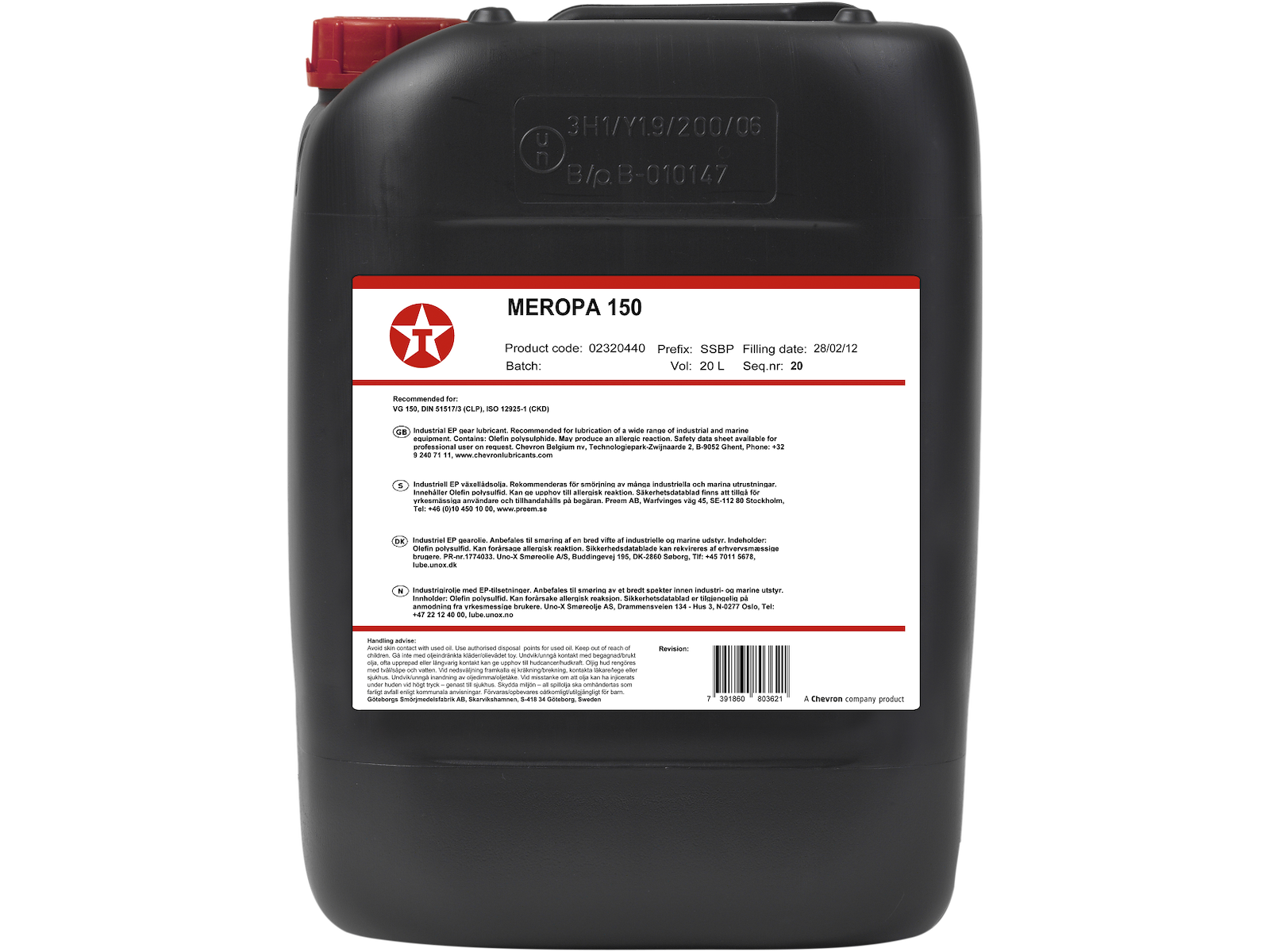 • Meropa højtryksgearolie additiveret med svovl og fosfor. Olien har fremragende egenskaber til at udskille vand, hvilket gør den velegnet til selv meget våde forhold. Olien anbefales til smøring af industri- og snekkegear, kædetræk, glide- og rulningslejer, glideflader m.v. Godkendelser: DIN 51517 / 3 (CLP), ISO 12925-1 (CKD). Fås i flere viskositeter og størrelser.