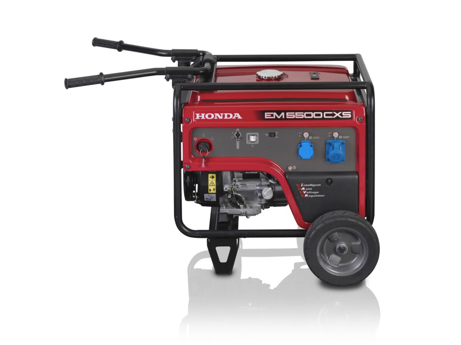 Kraftig rammegenerator med elstart, tomgangsautomatik og digital voltregulering. EM5500 er det første produkt med Hondas nye intelligente professionelle GX-motorer med elektronisk styring. Dette giver mulighed for at sænke omdrejningerne ved inaktivitet og derved spare brændstof og støje mindre. Generatoren leveres standard med et kraftigt hjul og håndtag, som gør generatoren let at transportere. den store tank på 23,5 liter giver lang driftstid på over 8 timer ved fuld belastning. En rigtig Honda.