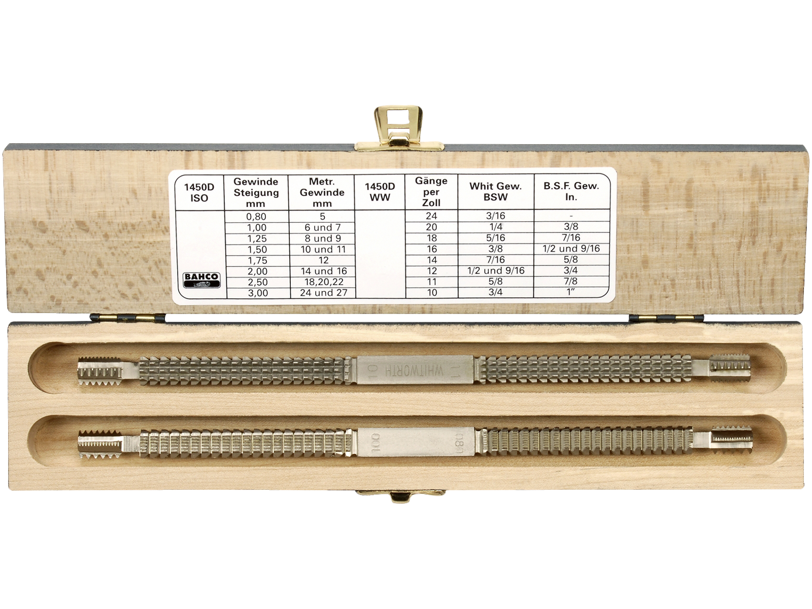 Sæt med 2 stk. dobbelte gevindfile til reparation af indvendige og udvendige gevind hhv. metriske og tommemål. Galvaniseret finish. Leveres i trææske medågevindtabel.