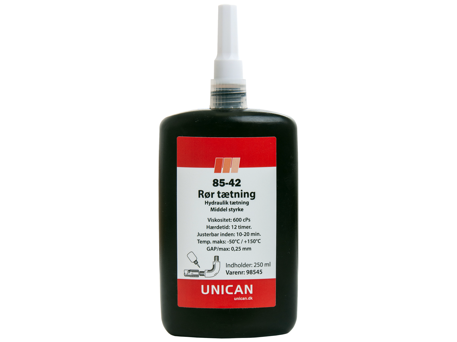 UniTite rør-, hydraulik- og gastætning. Tætner rør, fittings, grove gevind (3/4"), hydraulik, gas og sprinklersystemer osv. Produkterne fås i 2 styrker, svag og middel demonterbar. Hærdetiden er op til 24 timer og emnerne er justerbare indenfor 15-120 minutter, afhængig af hvilket produkt der er tale om. Temp. område mellem -55ºC til +150ºC.