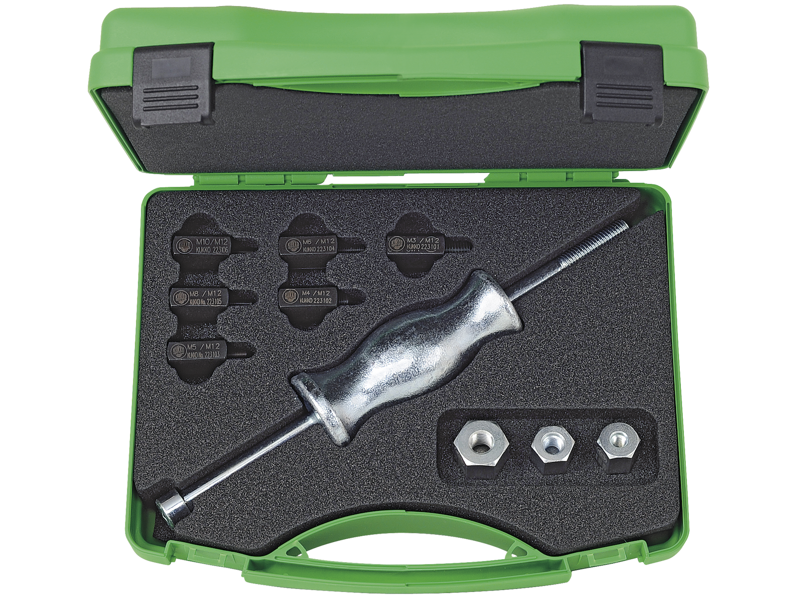 Dette 10-delte glidehammersæt i robust kasse er udviklet til sikker og effektiv udtrækning af bøsninger samt gevindmonterede komponenter som dorne, pasfjedre og bolte. Sættet er velegnet til brug i værksted, industri og håndværk, hvor der ofte ikke er en stabil støtteflade til rådighed.