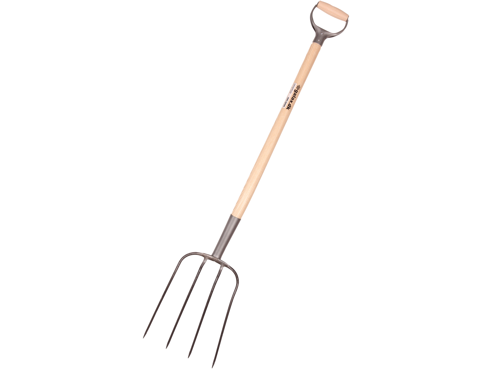 4-grenet spredegreb med lakeret asketræsskaft med D-greb i jern. Grebhoved 310×230 mm.
