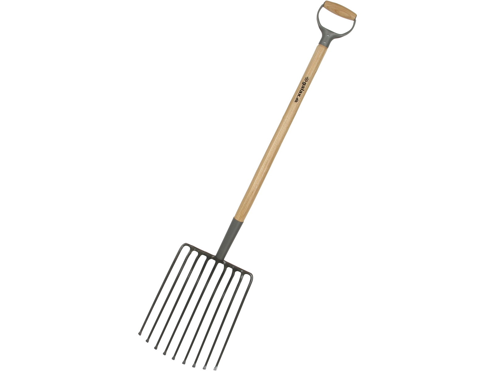 9-grenet stengreb til rensning af stenet jord. Model med runde tænder der afsluttes fladt og lakeret asketræsskaft med D-greb i jern. Grebhoved 370×270 mm.