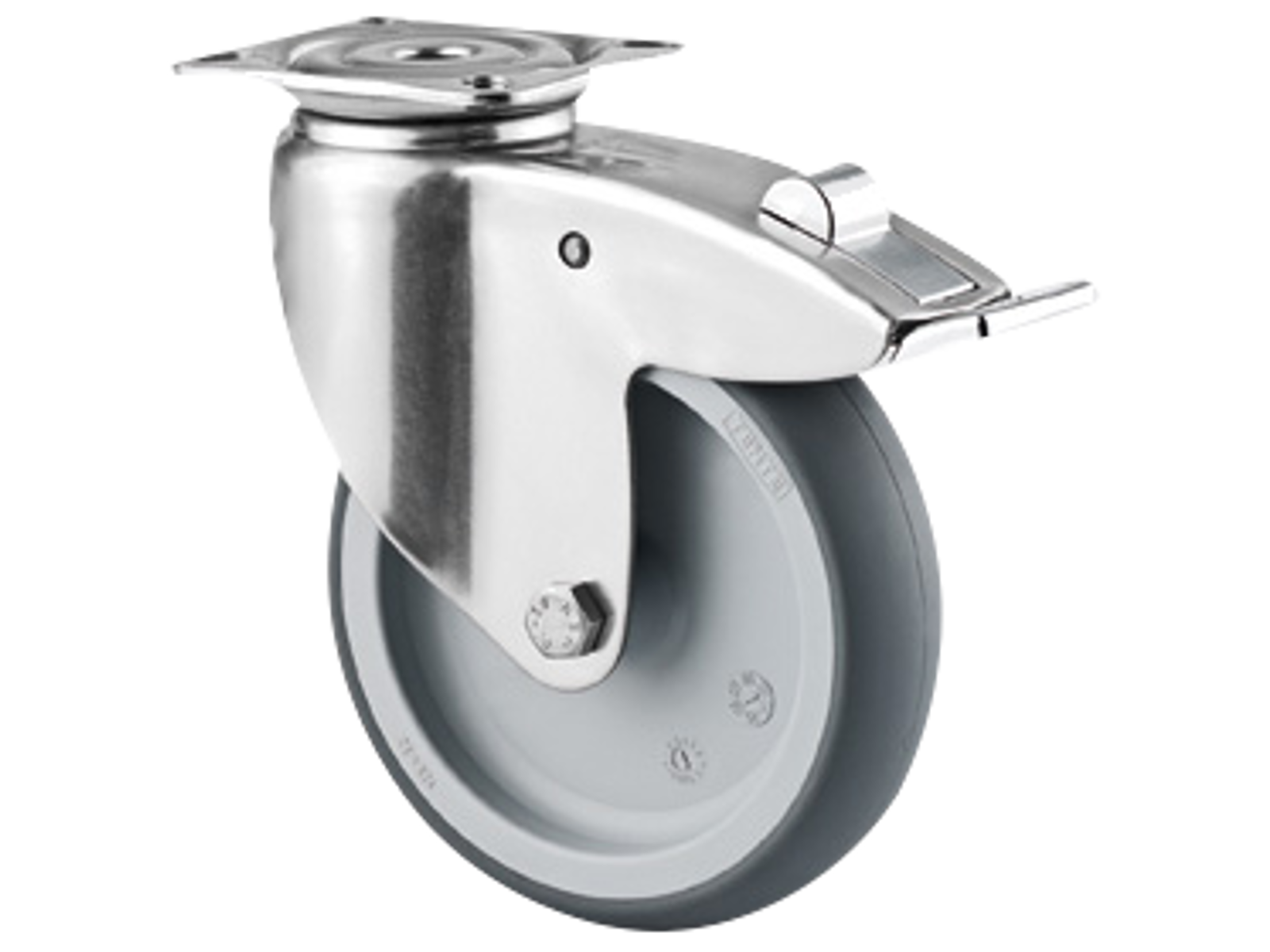 Drejeligt hjul med totalbremse. Rustfri, med bred gaffel. Dobbelt kuglekrans. Polypropylen grå gummi samt glideleje uden trådfang. Med centerhulsbefæstigelse eller plade.
