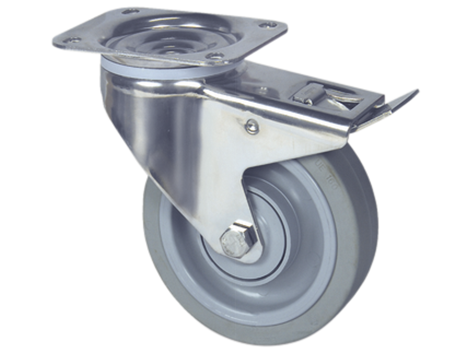 Drejeligt transporthjul i rustfri med totalbremse, bred gaffel og nittet dobbelt kuglekrans. Nav i polyamide med elastisk gummibane samt DIN-kugleleje med gummitætning. Med centerhul- eller pladebefæstigelse.