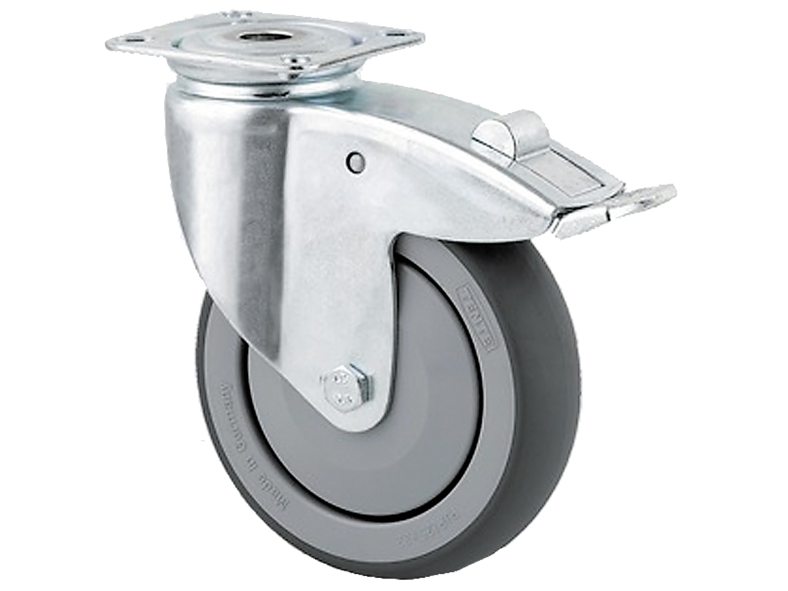 Drejeligt hjul med totalbremse, medium stålplade, bred gaffel og dobbelt kuglekrans, nittet. Polypropylen grå gummi med DIN-kugleleje. Med centerhulsbefæstigelse eller plade. Fås i flere dimensioner.