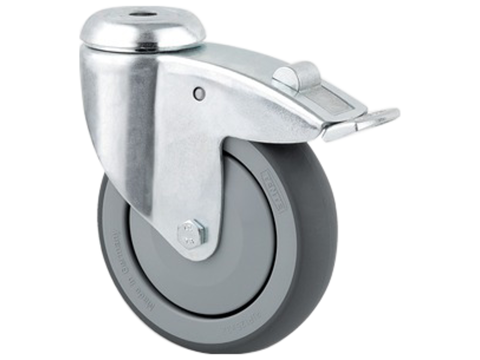 Drejeligt hjul med totalbremse, medium stålplade, bred gaffel og dobbelt kuglekrans, nittet. Polypropylen grå gummi med DIN-kugleleje. Med centerhulsbefæstigelse eller plade. Fås i flere dimensioner.