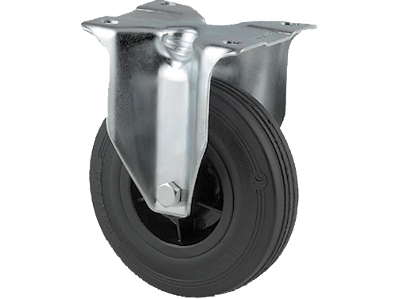 • Fast hjul med bred gaffel i svær stålplade. Sort massiv polypropylen gummi med rulleleje uden trådfang. Med pladebefæstigelse.
