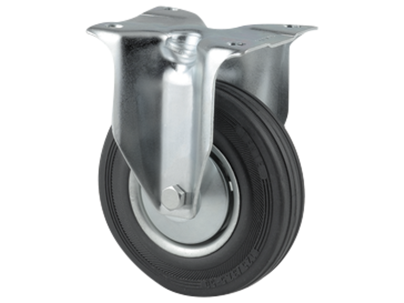 Fast hjul med bred, ret gaffel i svær stålplade samt dobbelt kuglekrans. Fælg af svejst stål med rulleleje med trådfang. Hjulbanen er fremstillet af sort massiv gummi. Med pladebefæstigelse. Fås i flere dimensioner.