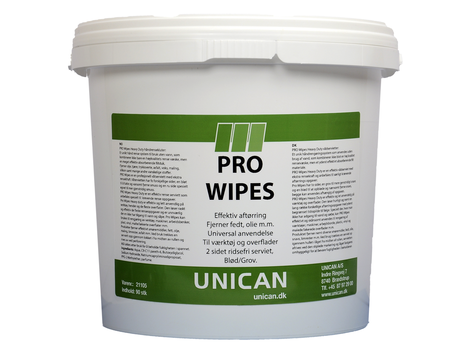 PRO Wipes Heavy Duty vådservietter. Et unik håndrengøringssystem som anvendes uden brug af vand, som kombinerer ikke blot en høj kvalitets rensevæske, men også et yderst effektivt absorberende filt materiale. PRO Wipes Heavy Duty er en effektiv vådserviet med ekstra rensekraft og anbefales til særligt krævende aftørrings opgaver. Pro Wipes har to sider, en grov til mere genstridigt snavs og en blød der nænsomt fjerner snavs, begge kan anvendes afhængig af opgaven. PRO Wipes Heavy Duty er effektiv og let anvendelig på værktøj og andre overflader. Den løser hurtigt og nemt en lang række forskellige aftørringsopgaver med yderst begrænset tidsspilde til følge. ProWipes virker decificerende og specielt der, hvor man ikke har adgang til vand og sæbe, kan PRO Wipes effektivt og skånsomt anvendes til rengøring af værktøjer, maskiner, arbejdsborde, plastik, vinyl og malede/lakerede overflader m.m. Til hænder anbefales vor CW-3 Uni Wipes.