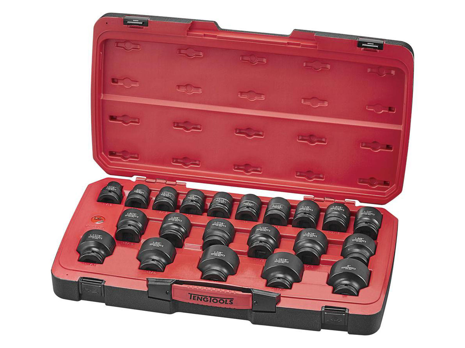 DIN-standarddesign til brug med låsestift og -ring. Krommolybdæn-stål til brug med elværktøj. Sort fosfatfinish for nem identifikation som en slagtop. Udviklet og fremstillet iht. DIN3129. Monteringsåbning med ring og stift i hundelen til fastgørelse af toppen. Monteringsring og stift er inkluderet i sættet. Leveres i slidstærk Teng Tools-kuffert med tydeligt logo. Toppenes åbenlyse placering gør det nemt at se, hvor de enkelte størrelser hører til.