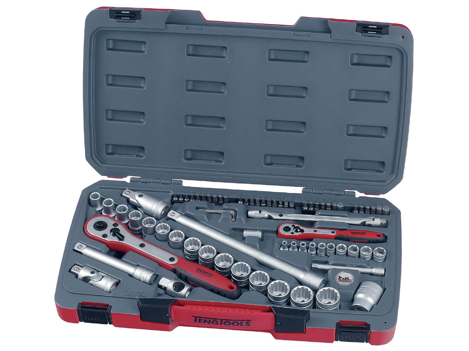 Teng Tools 1/4" og 1/2" topnøglesæt med 72 dele. Indeholder fiberforstærket skraldenøgle, forlængerstykker, bitstop, bi-fleksnøgle, sekskantnøgler, kardanled, forstørrelsestap, ledhoved, korte toppe samt bits.