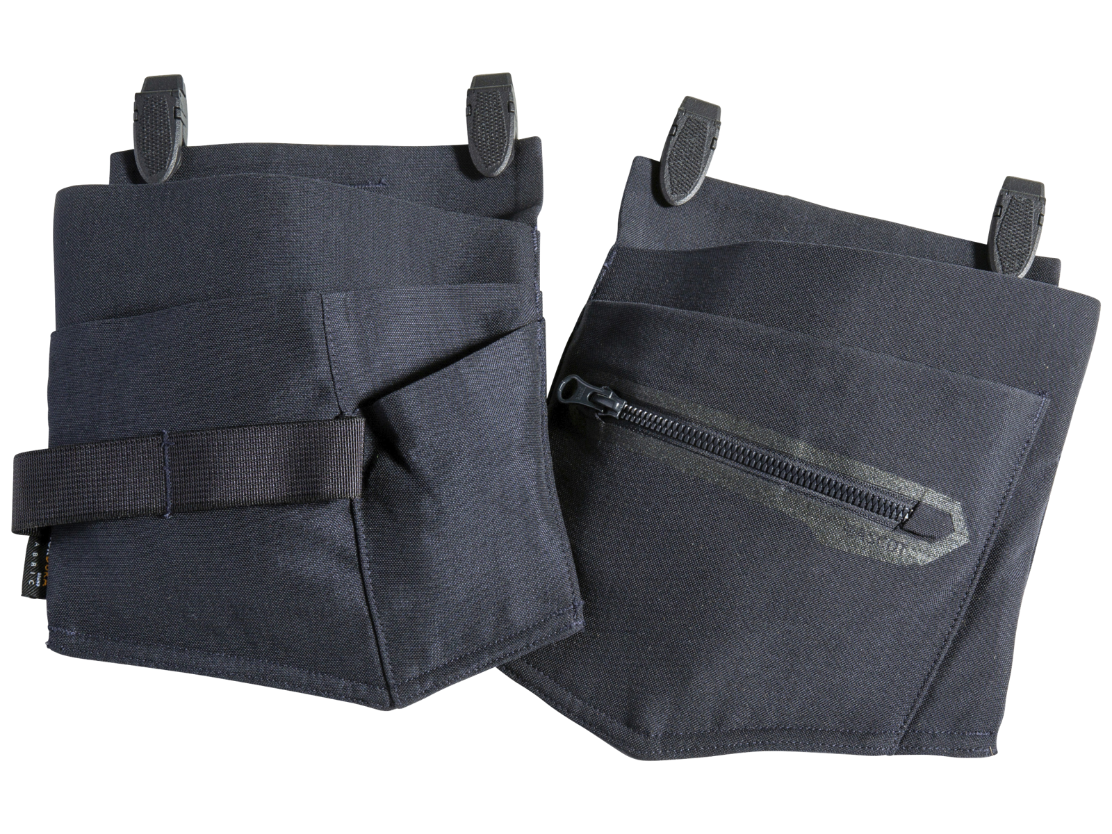 Customized sæt med 2 hængelommer. Individuel placering med Click Pocket System. Kan placeres i både højre og venstre side. Stor slidstyrke og mange lommer, alle med lukket bund. Den ene hængelomme har 2 store rummelige lommer og 1 vandtæt lomme med lynlås. Den anden hængelomme har 2 store rummelige lommer, 2 stropper og 1 mindre lomme til værktøj. Kan nemt og individuelt fastgøres med Click Pocket System. Strop til ophængning efter afmontering. Måler 20×25 cm. Fås i flere farver.