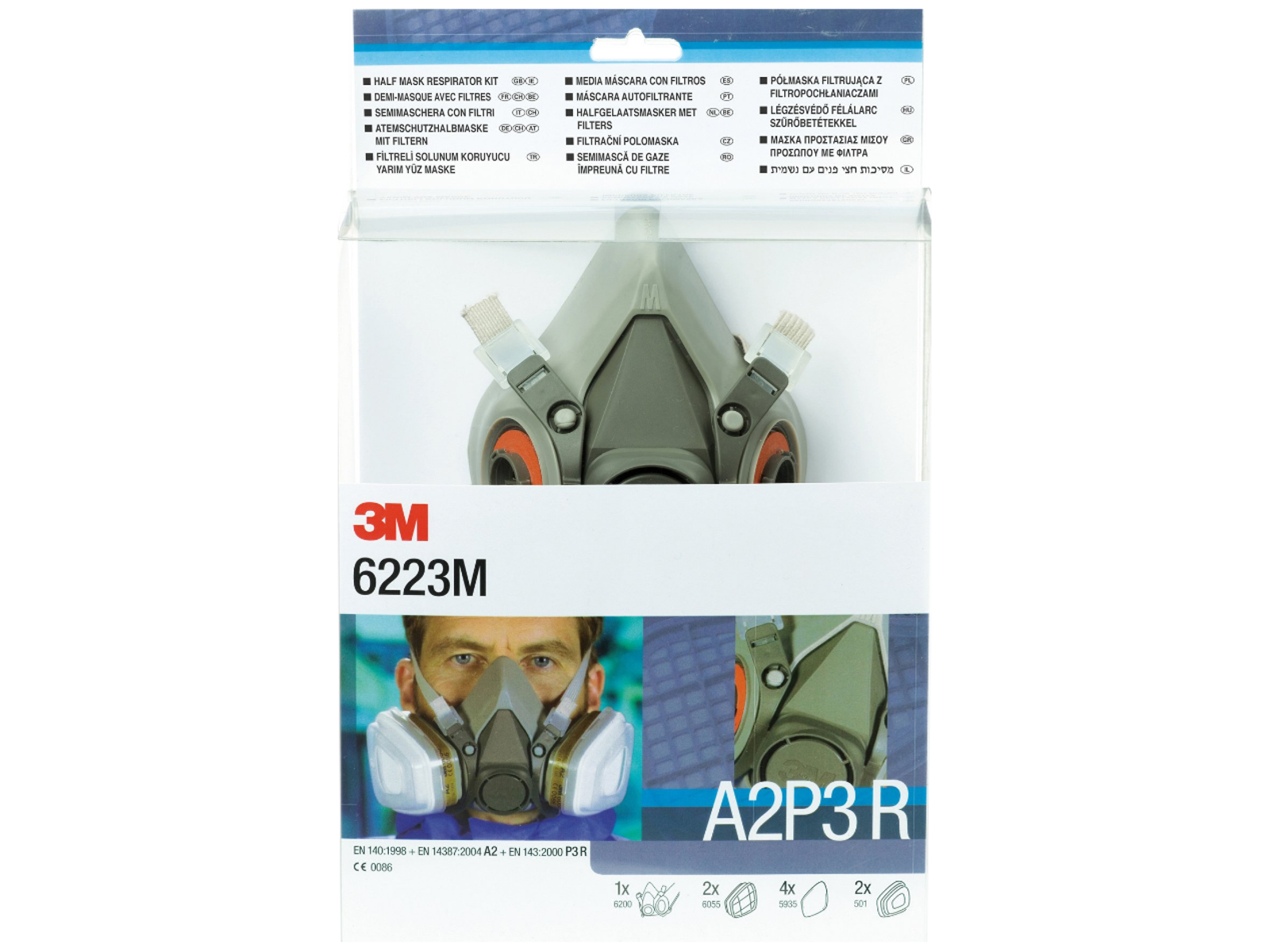 Halvmaske i termoplastisk elastomer, med bajonetfatninger for filtre serie 6000. Leveres som packout-løsning, komplet med 1 par A2 gasfiltre, 2 par P3 støvfiltre samt filterholder 501.