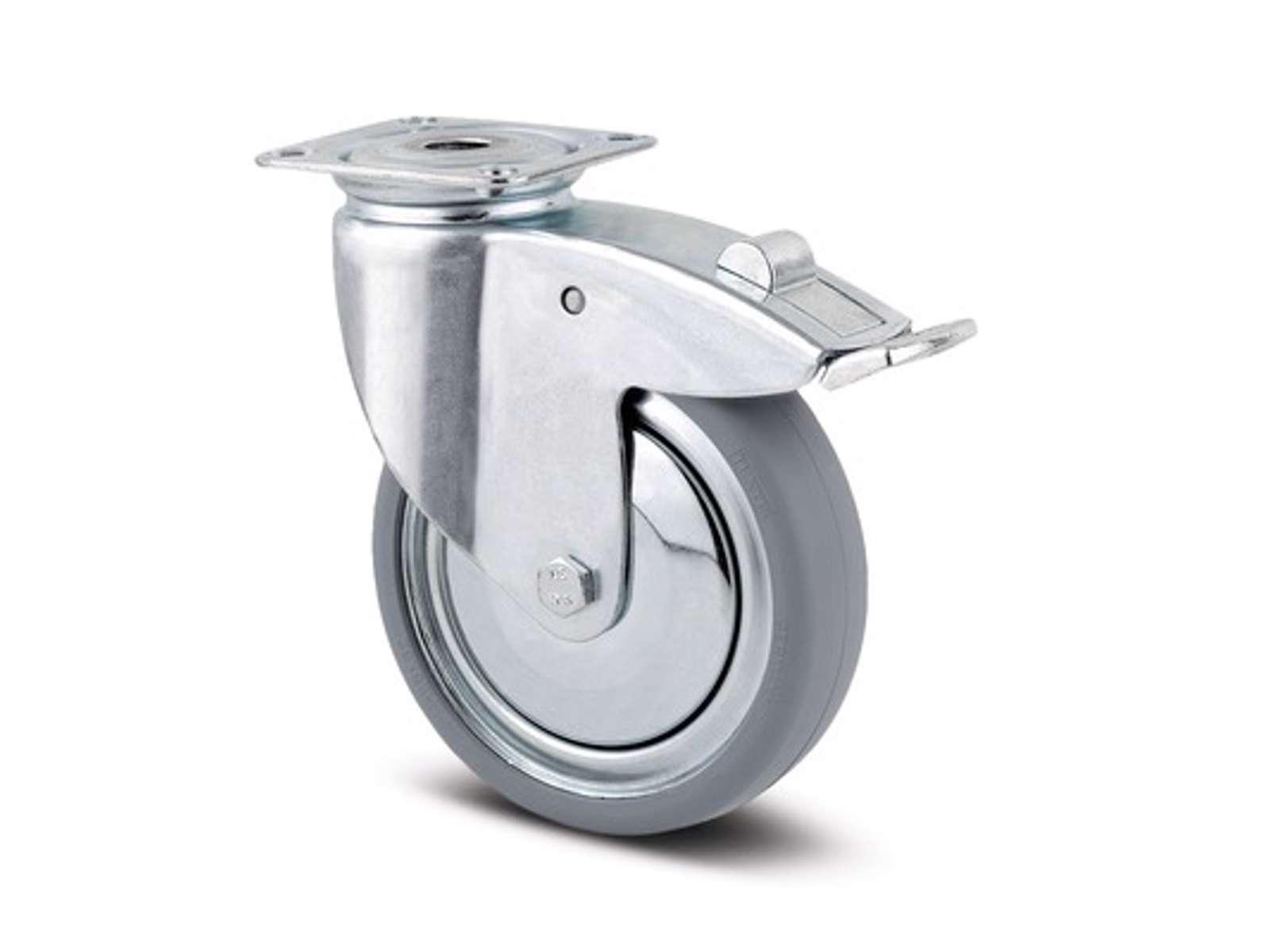 Drejeligt hjul med totalbremse, medium stålplade, bred gaffel og dobbelt kuglekrans, nittet. Svejst stålfælg med grå gummi og konus-kugleleje. Med centerhulsbefæstigelse eller plade. Fås i flere dimensioner.