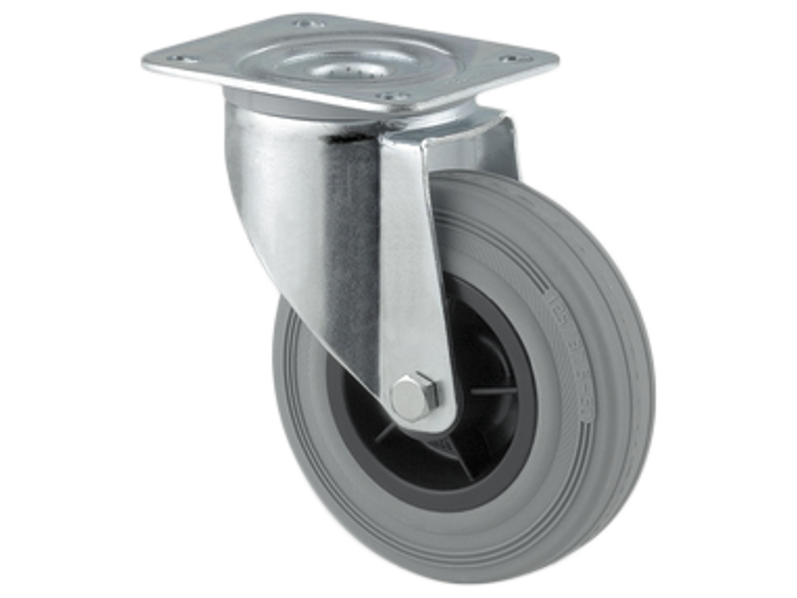 Grå gummihjul drejelig, Til plademontering. Tåler 70 kg