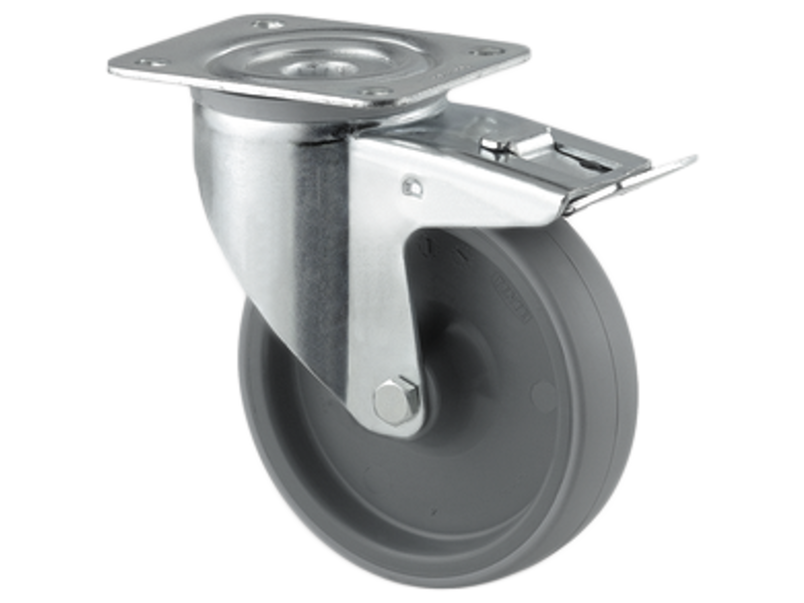 Drejeligt hjul med bremse, 80 mm. Transport, belastning 150 kg. Nav i polyamide med polyuretanbane. Rulleleje. GRÅ