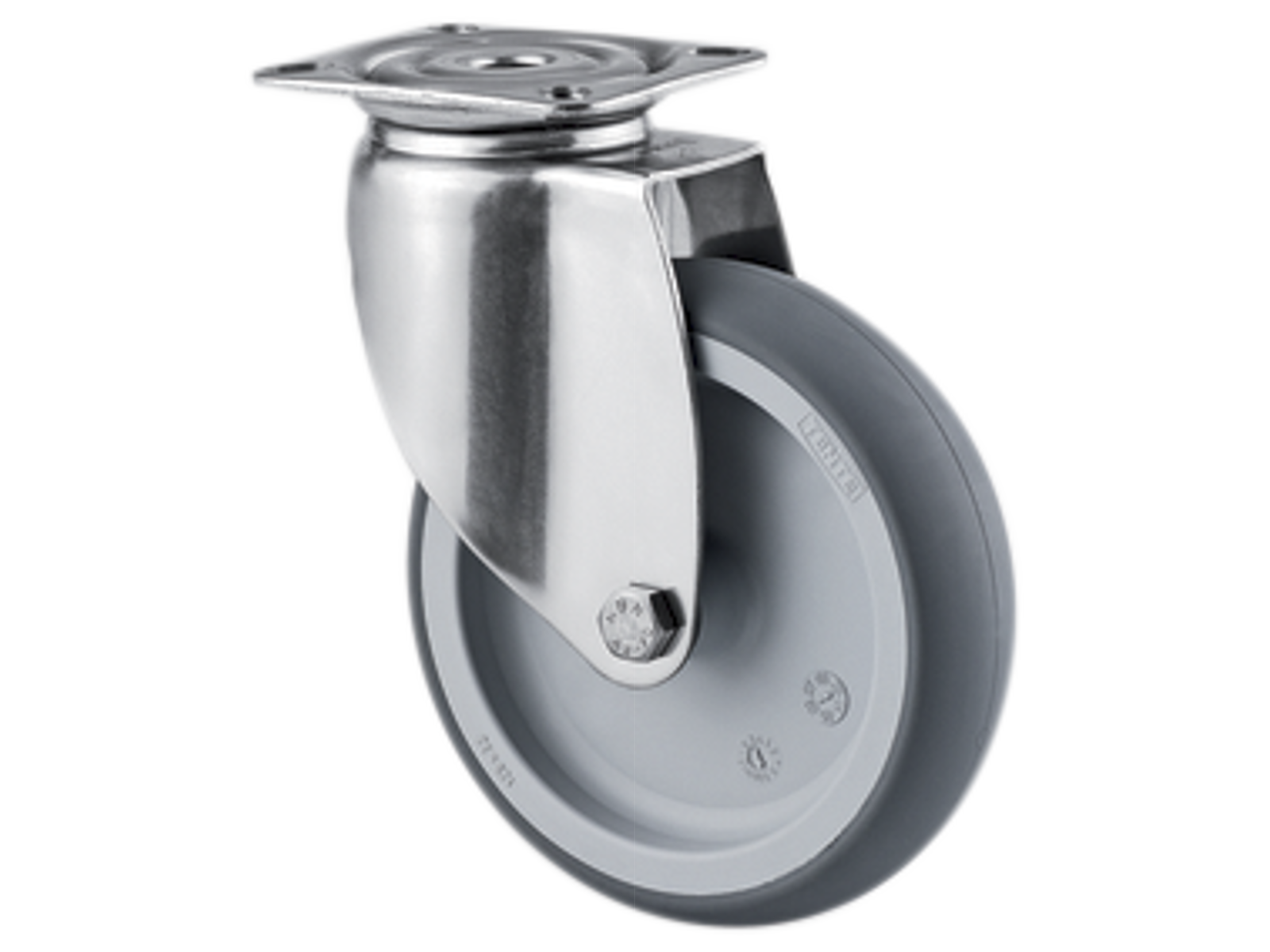 Drejeligt hjul med bred rustfri gaffel og dobbelt kuglekrans, nittet. Med polypropylen gummi og glideleje uden trådfang. Med centerhulsbefæstigelse eller plade. Fås i flere dimensioner.