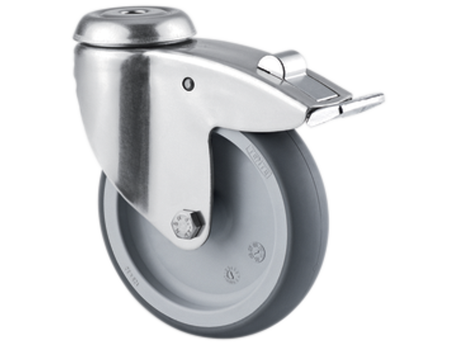 Drejeligt hjul med totalbremse. Rustfri, med bred gaffel. Dobbelt kuglekrans. Polypropylen grå gummi samt glideleje uden trådfang. Med centerhulsbefæstigelse eller plade. Fås i flere dimensioner.
