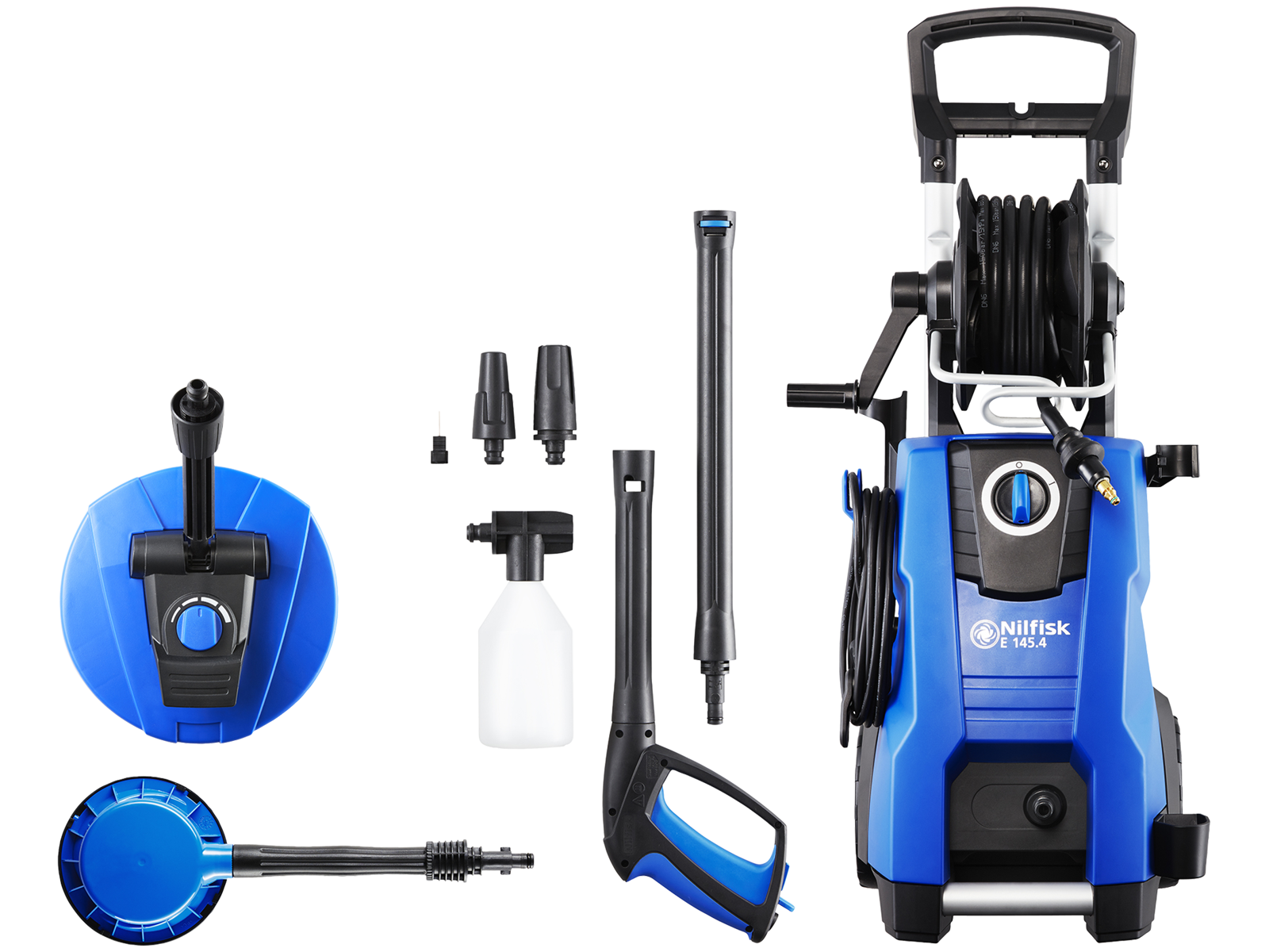 E 145.4-9 er en kraftig, støjsvag højtryksrenser med lang levetid - ideel til regelmæssige og store rengøringsopgaver. Den kraftige højtryksrenser med robust induktionsmotor klarer effektivt hyppig rengøring og store rengøringsopgaver. Den er ergonomisk i designet og med stor rækkevidde pga. den stålarmerede højtryksslange. Alsidige: fra skånsom rengøring af bløde og sarte overflader til effektiv fjernelse af fastgroet snavs. Højtryksrenseren har en række vigtige funktioner til langvarigt arbejde såsom teleskophåndtag, kraftige hjul og enhåndsbetjent slangetromle samt gummiophæng, der gør maskinen ekstra støjsvag. Kan bruges med vægkrog til tilbehør for stationær brug. Robust design med aluminiumspumpe og robust induktionsmotor med lang levetid. Automatisk start/stop-system. 9 mtr. højtryksslange og enhåndsbetjent slangetromle. Teleskophåndtag med stabile og robuste aluminiumsrør. Praktisk opbevaring af sprøjtepistol, dyserør, dyser og skumforstøver på højtryksrenseren. Praktisk opbeva