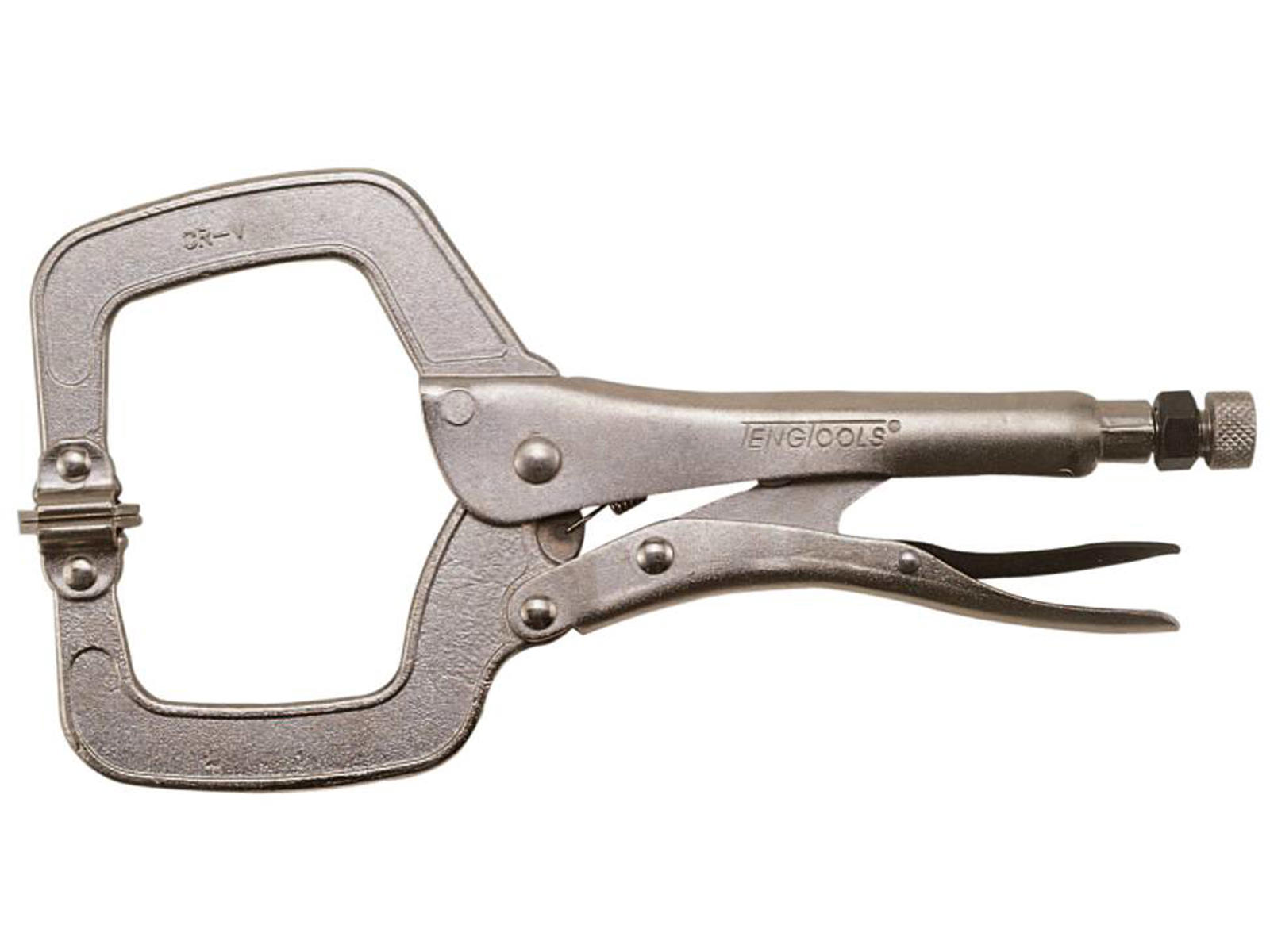 C-tang med drejelige kæber til fastholdelse af profilerede materialer. Selvlåsende og med udløsningsarm. Forniklet.