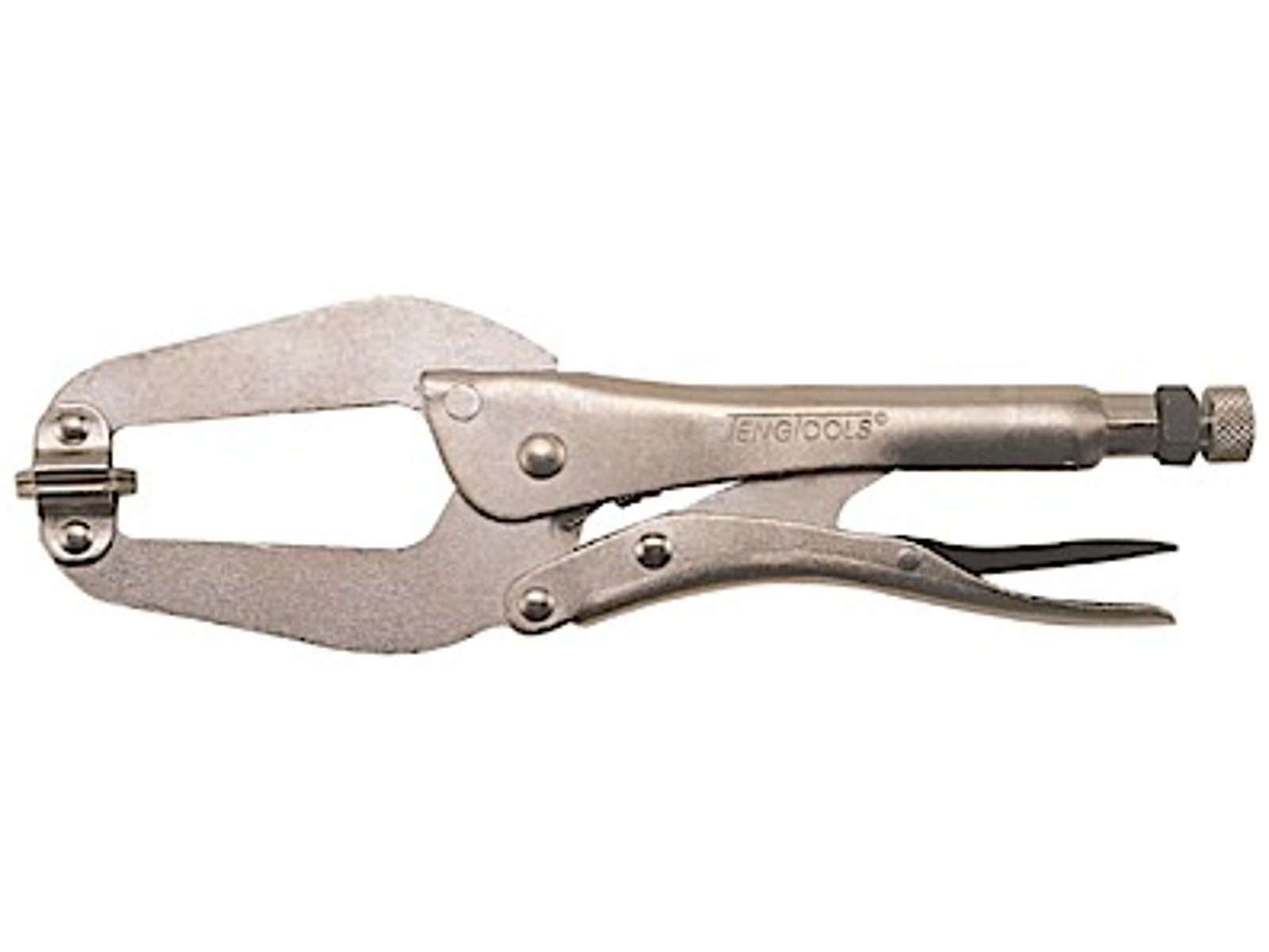 Med drejelige kæber til fastholdelse af profilerede materialer. Selvlåsende og med udløsningsarm. Forniklet.