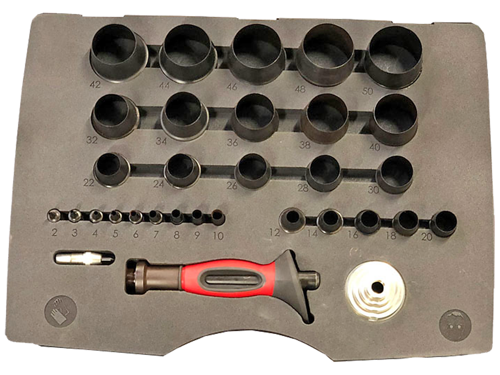 Huggepibesæt til udstansning i pap, plast, blødt plast, gummi, blødt gummi, forstærket gummi med magnet, aluminium (op til 0,3 mm tykkelse), læder, papirbånd, skum, kork, stof mv. Sættet indeholder 32 dele i størrelserne 2, 3, 4, 5, 6, 7, 8, 9, 10, 12, 14, 16, 18, 20, 22, 24, 26, 28, 30, 32, 34, 36, 38, 40, 42, 44, 46, 48 og 50 mm. Leveres samlet i praktisk æske.