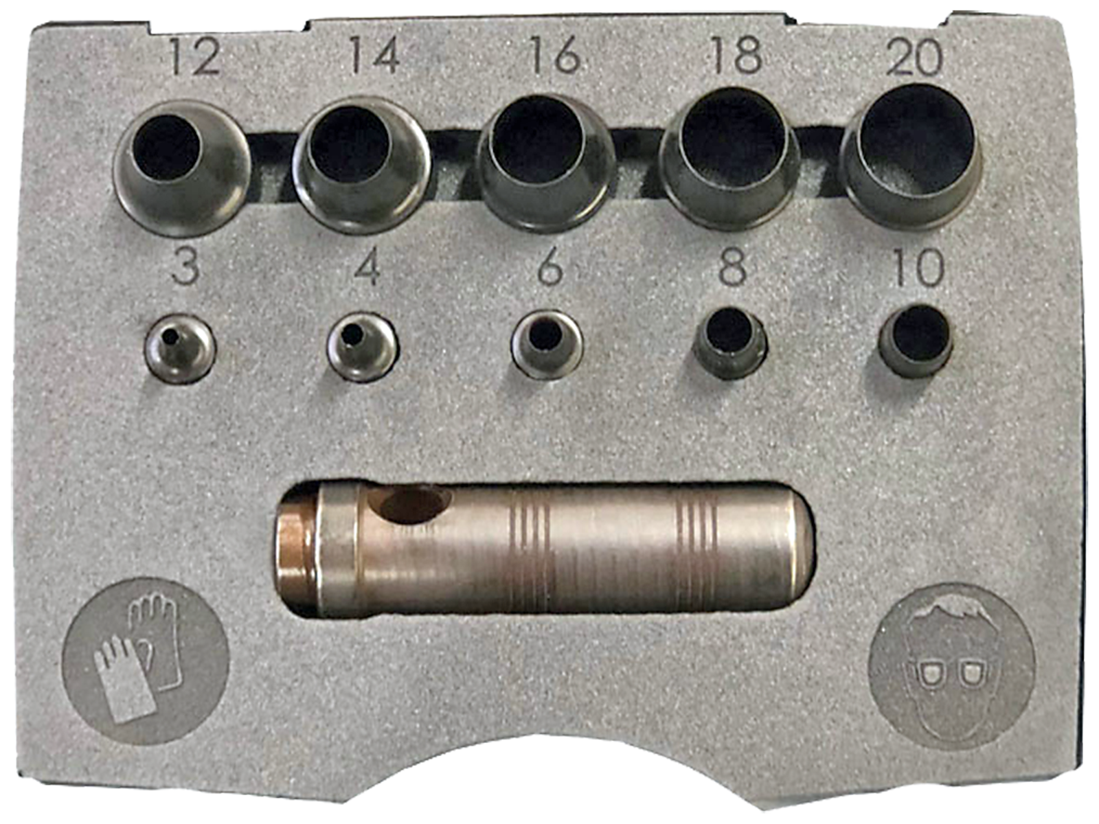 Huggepibesæt til udstansning i pap, plast, blødt plast, gummi, blødt gummi, forstærket gummi med magnet, aluminium (op til 0,3 mm tykkelse), læder, papirbånd, skum, kork, stof mv. Sættet indeholder 11 dele i størrelserne 3, 4, 6, 8, 10, 12, 14, 16, 18 og 20 mm. Leveres samlet i praktisk æske.