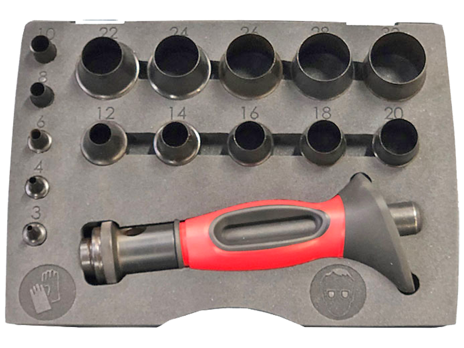 • Huggepibesæt til udstansning i pap, plast, blødt plast, gummi, blødt gummi, forstærket gummi med magnet, aluminium (op til 0,3 mm tykkelse), læder, papirbånd, skum, kork, stof mv. Sættet indeholder 16 dele i størrelserne 3, 4, 6, 8, 10, 12, 14, 16, 18, 20, 22, 24, 26, 28 og 30 mm. Leveres samlet i praktisk æske.