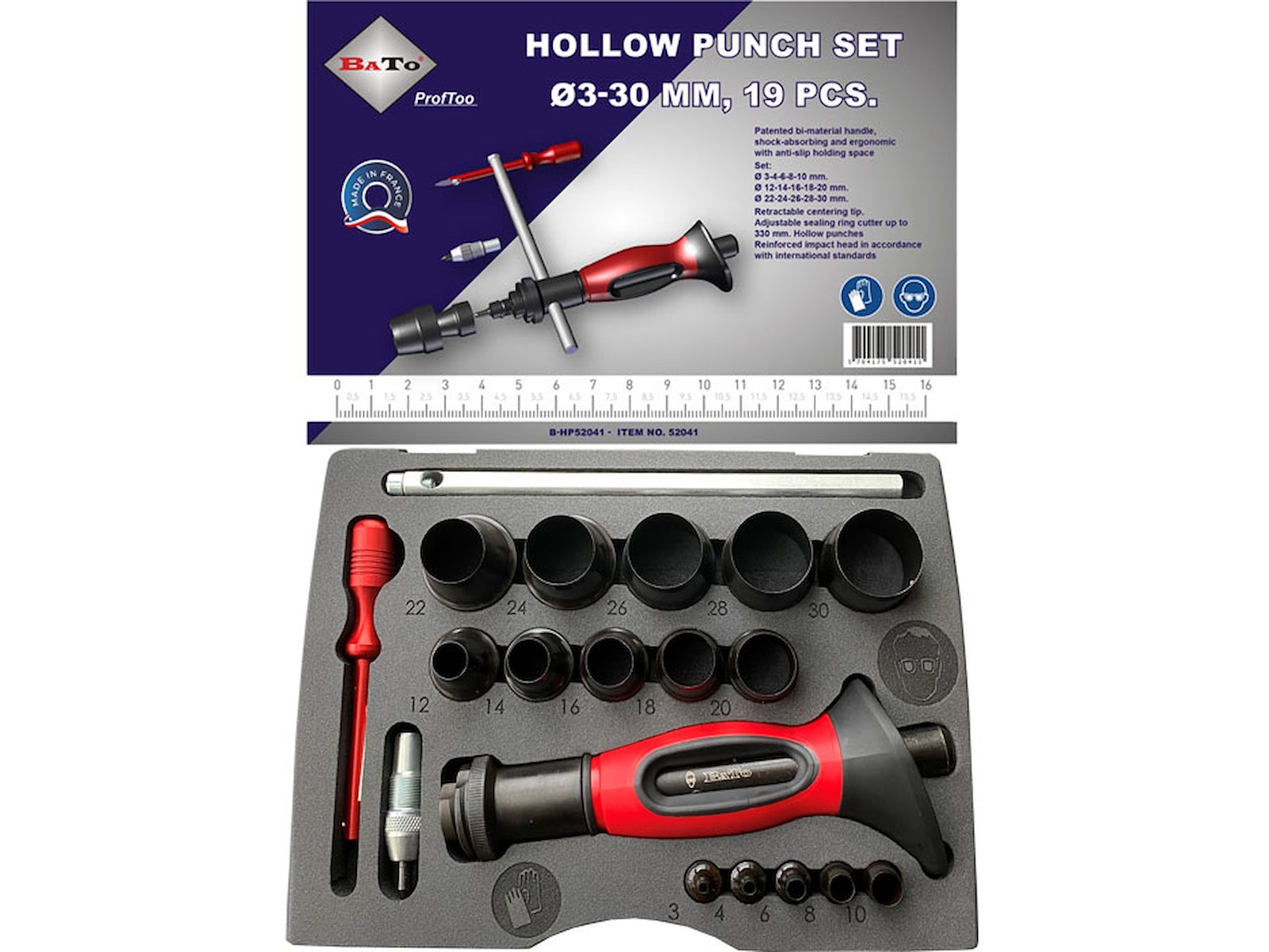 15 forskellige størrelser: 3-4-6-8-10-12-14-16-18-20-22-24-26-28-30mm. Huggepibesæt til udstansning i pap, plast, blødt plast, gummi, blødt gummi, forstærket gummi med magnet, aluminium (op til 0,3 mm tykkelse), læder, papirbånd, skum, kork, stof mv. Leveres samlet i praktisk æske.