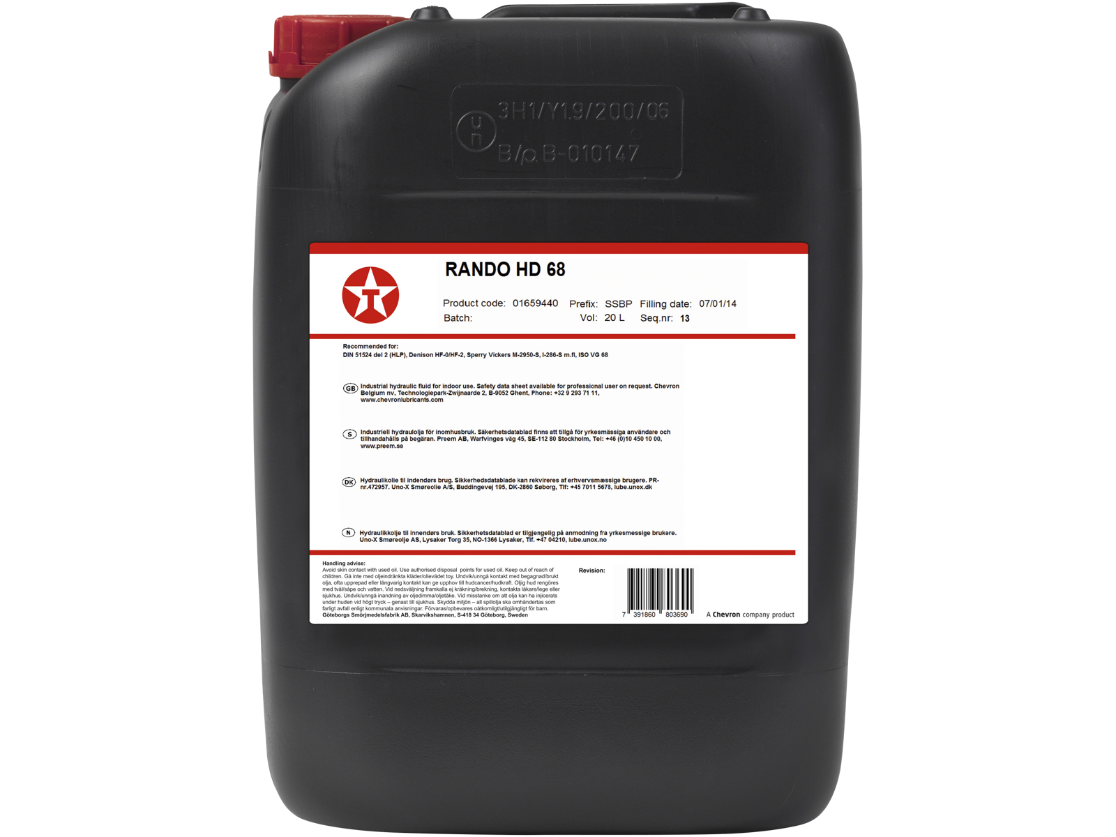 • Rando HD er en zinkbaseret hydraulikolie til brug i industrielle og mobile hydrauliksystemer. Produktserien er formuleret på basis af Gruppe II baseolie i kombination med korrosions, -og oxidationsinhibitorer, anti-skum og meget stabile anti-slid additiver, der beskytter pumpe og stempel. Anbefales til brug i mange højtydende industrielle og mobile hydrauliske applikationer, der arbejder under moderate temperaturer. Specifikationer/godkendelser: DIN 51524-2:HLP, ISO 11158: Class HM m.fl. Fås i flere varianter.