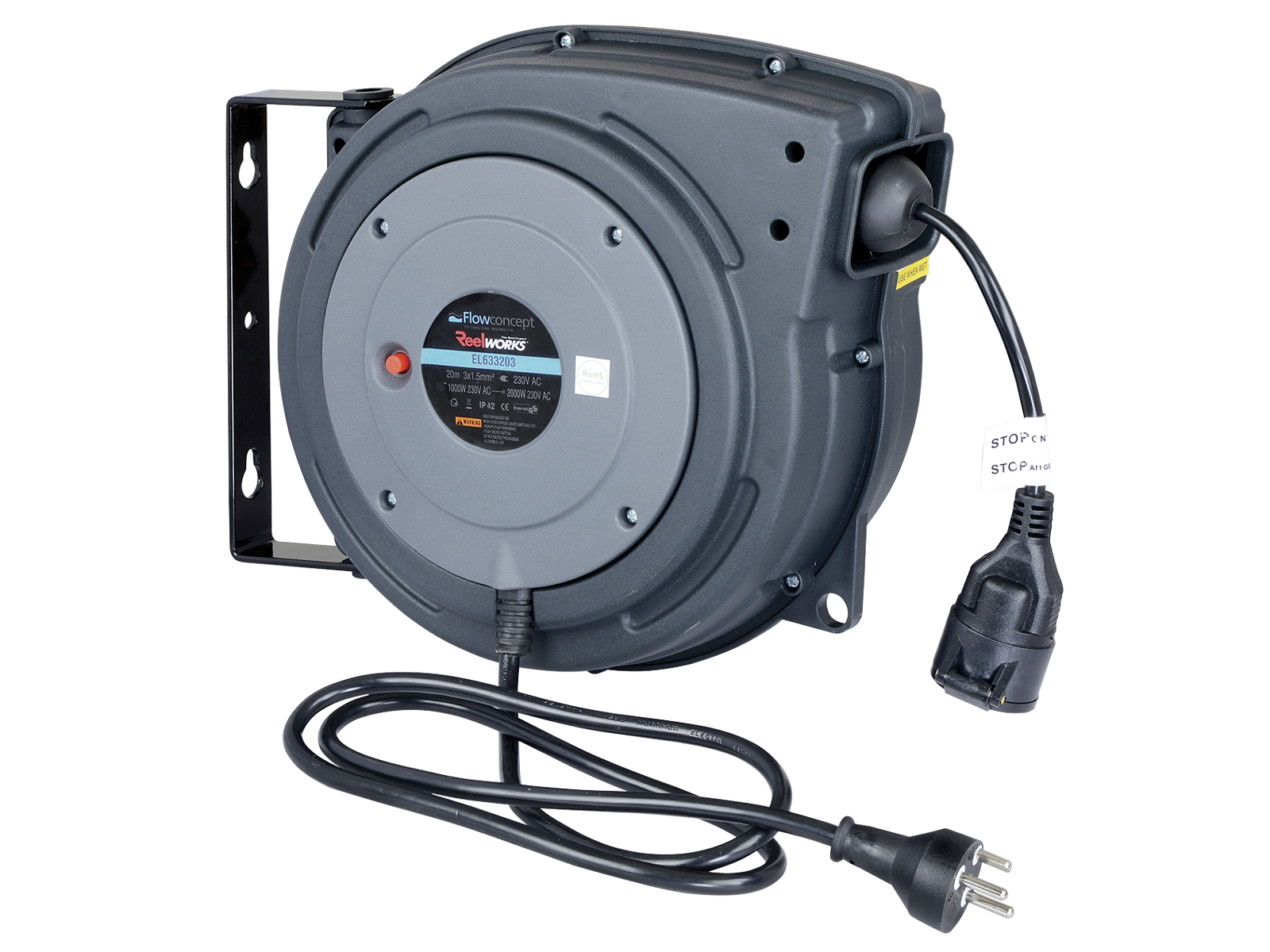 Automatisk kabelopruller med boks i slagfast polypropylen med drejeligt væg-/loftbeslag. Låser automatisk kablet når den ønskede længde er nået. IP klasse 42.