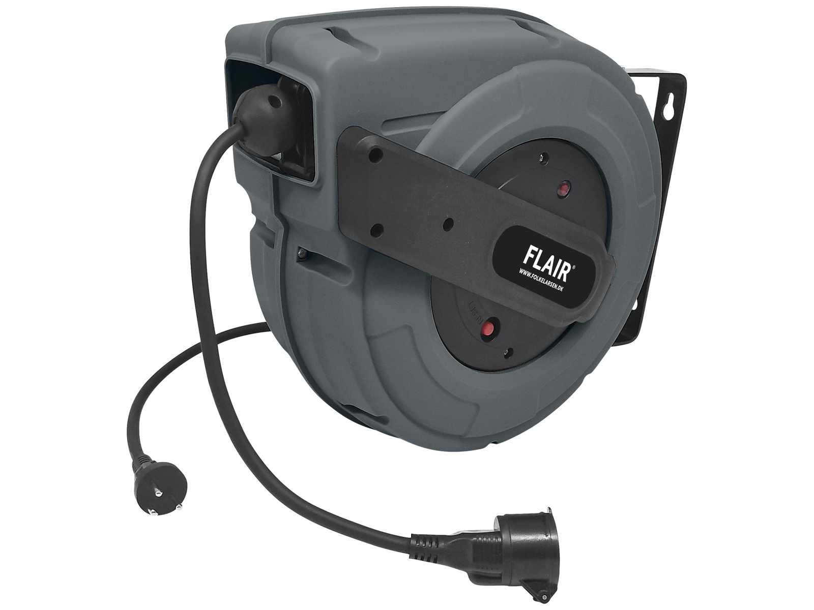 Flair kabelopruller i højkvalitets PP-kabinet. Denne kabelopruller har en indbygget fjeder, der er i stand til, automatisk at oprulle slangen. Kabeloprulleren kan monteres enten på væggen eller loftet ved hjælp af medfølgende monteringsbeslag, som tillader den at svinge 180°. Længden på kablet er 25 meter. Kabelfører sikrer, at kablet rulles pænt på plads hver gang. Kabinettet er produceret i ekstra stærkt materiale og tåler hård belastning.