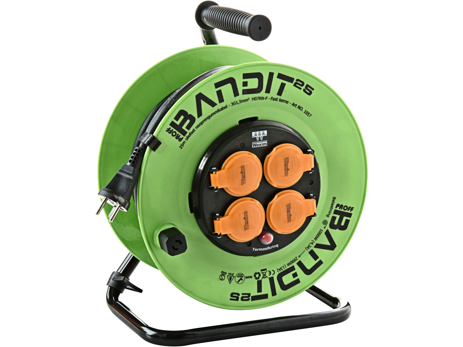 Bandit kabeltromle med jord og fast kerne, så man slipper for ledningsrod. Monteret med neopren-gummikabel H07RN-F. Fås med flere længder.