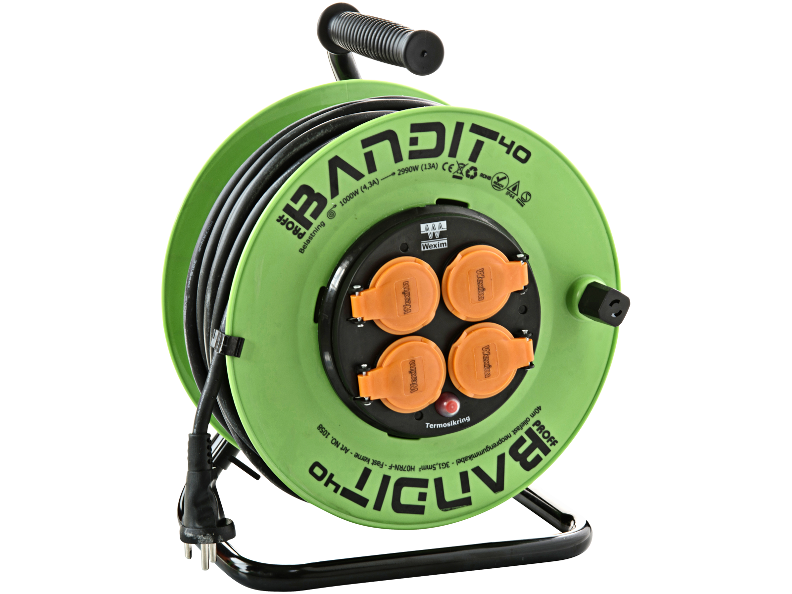 Bandit kabeltromle med jord og fast kerne, så man undgår ledningsrod. Monteret med neopren-gummikabel H07RN-F.