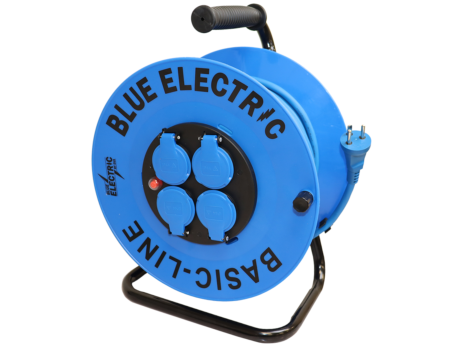 Blue Electric Basicline kabeltromle med 4 tildækkede strømudtag og termosikring for høj arbejdssikkerhed. Kabeltromlen er udstyret med neoprengummikabel i 3×1,5 mm² H07RN-F og hårdført dansk jordstik. Det blå kabel laver ikke afmærkninger på lyse gulve, som traditionelt sort gummineopren kabel. IP44.