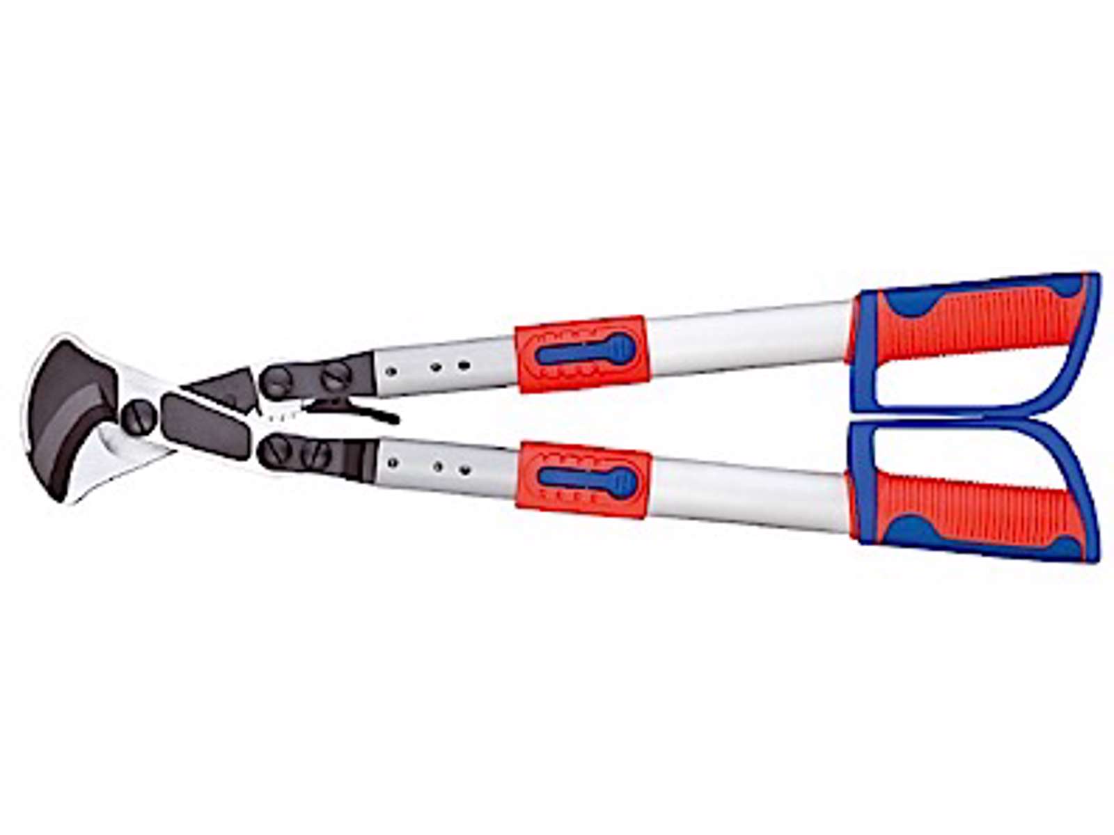 Sort atrametneret, hoved poleret, greb med flerkomponent-håndtag. Solid. Handy. Stabil. Helt nyt tandkransdrev. Til kabler med op til 60 mm diameter. Let håndtering pga. lav vægt (825 g) og kompakt konstruktion (320 mm længde), kan også anvendes ved trange pladsforhold. Skærer Cu- og Al-kabler op til en diameter på 60 mm ved brug af en og to hænder. Hærdede skær med præcisionsslibning, skærer glat og ordentligt uden at klemme. Til at skære Cu- og Al-kabler, en- og flertrådede (uegnet til ståltråd og stålwirer). Innovativt 3-gearet tandkransdrev med høj udveksling for nemt at skære med en og to hænder. Hylster til det faste ben med ståflade til at ligge på under skæring. Special-værktøjsstål af særlig kvalitet, smedet, oliehærdet.
