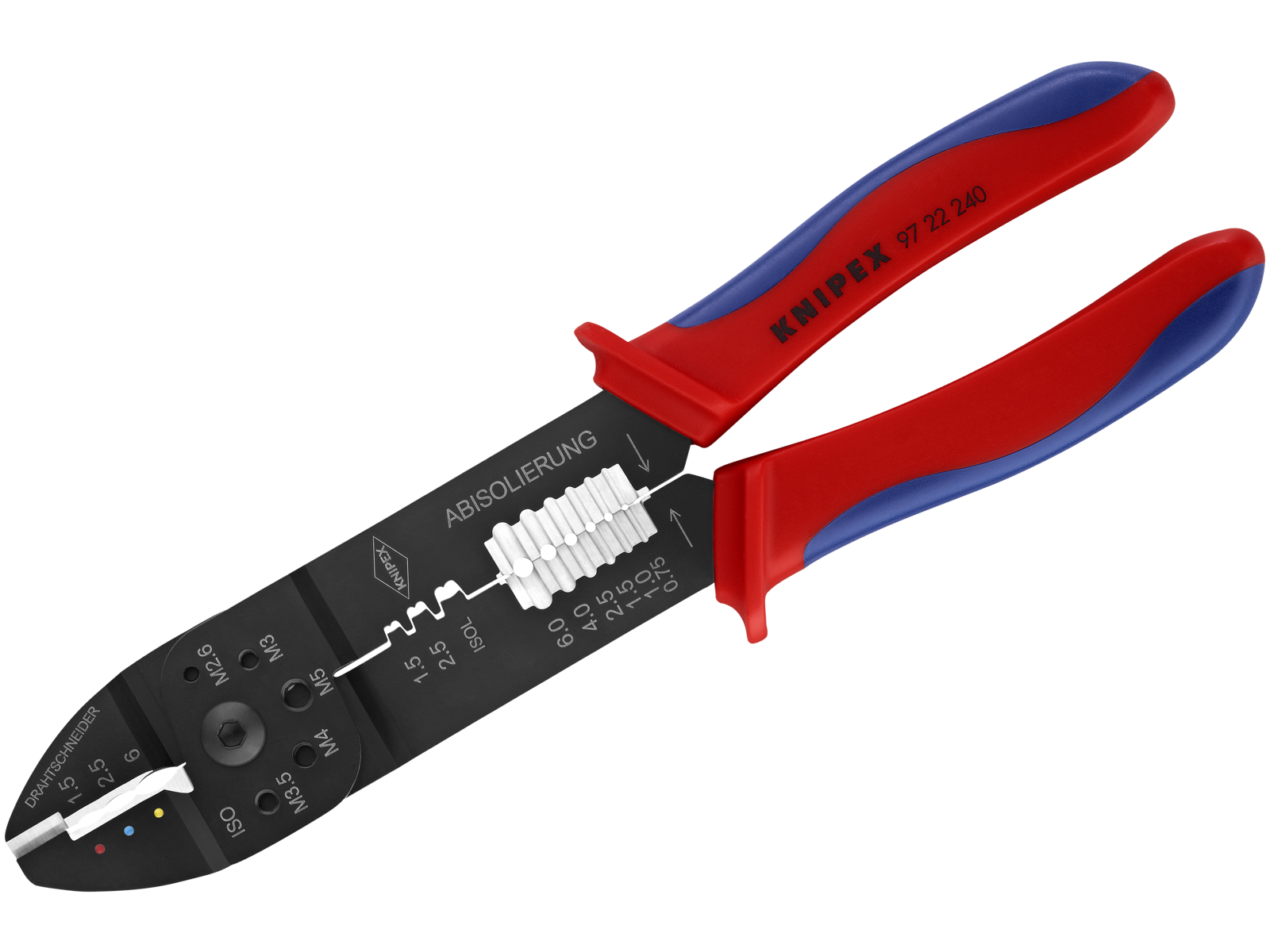 Til at skære kabler, afisolere tråde og crimpe isolerede og uisolerede kabelsko og stikforbindere og åbne stikforbindere. Med gevindhuller til afskæring af Cu- eller Ms-gevindtapper M2,6 / M3 / M3,5 / M4 og M5. Skruet led for høj stabilitet og ensartet løb. Specialstål, særdeles solidt.