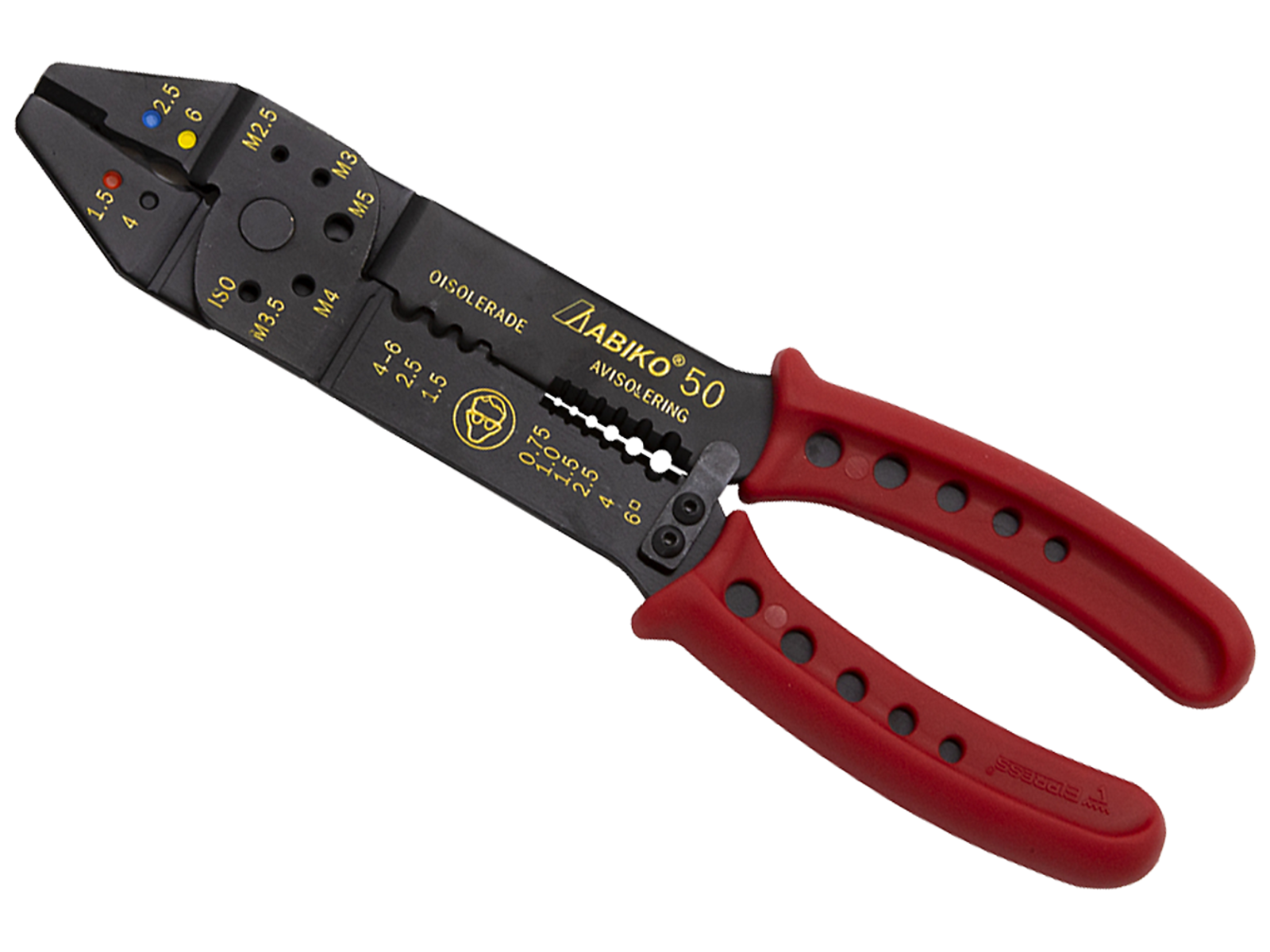Kontaktpresser isolerede forbindelser 0,5-6 mm². Knoppresser uisolerede forbindelser 1,5-6 mm². Med røde, semi-soft håndtag for optimal komfort.