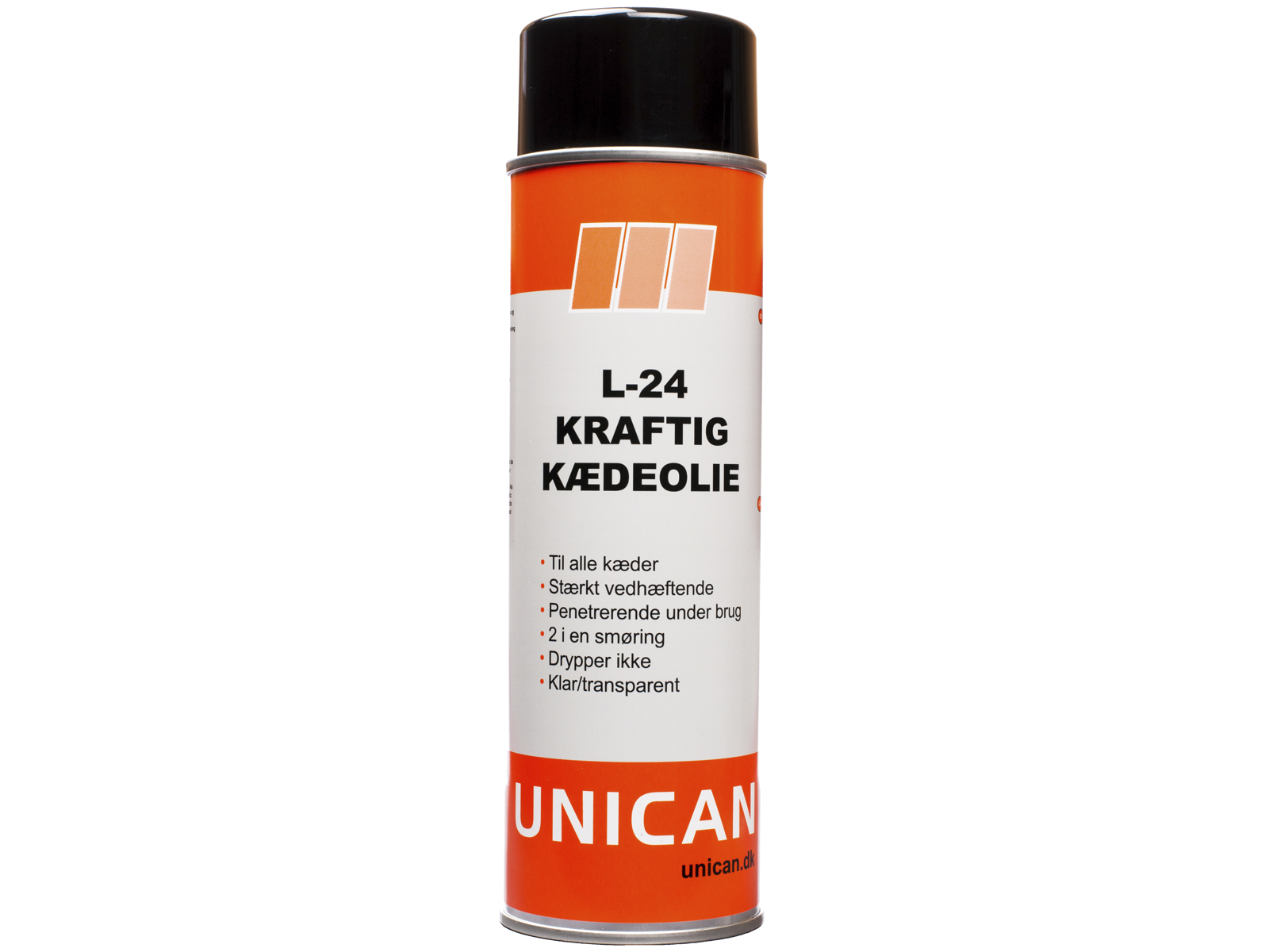 Tilsat kraftig korrosionsbeskyttende additivpakke. L-24 Kraftig Kædeolie er en yderst vedhæftende klar olie til smøring af kæder indenfor en lang række forskellige industrier. Produktet er yderst resistent overfor vandafvaskning og kan anvendes i både tørre og våde miljøer. L-24 Kraftig Kædeolie er anvendelig til smøring af hængsler, tandhjul, gear, snegle, conveyors m.m. Den kraftige oliefilm giver ekstra lange smøreintervaller og beskytter samtidig mod rust og tæring. Den store vedhæftningsevne gør desuden L-24 Kraftig Kædeolie i stand til effektivt at løse smøreopgaver med hurtigløbende kæder uden risiko for, at olien bliver slynget af. Brug L-24 alle steder, hvor en stærk ikke afsmittende smøring ønskes. L-24 Kraftig Kædeolie kan anvendes indenfor et bredt temperaturområde fra -30°C til +200°C.