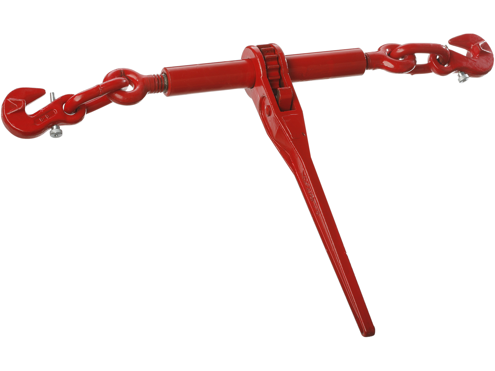Rødmalet surringstrammer med skralde og sikkerhedspal.