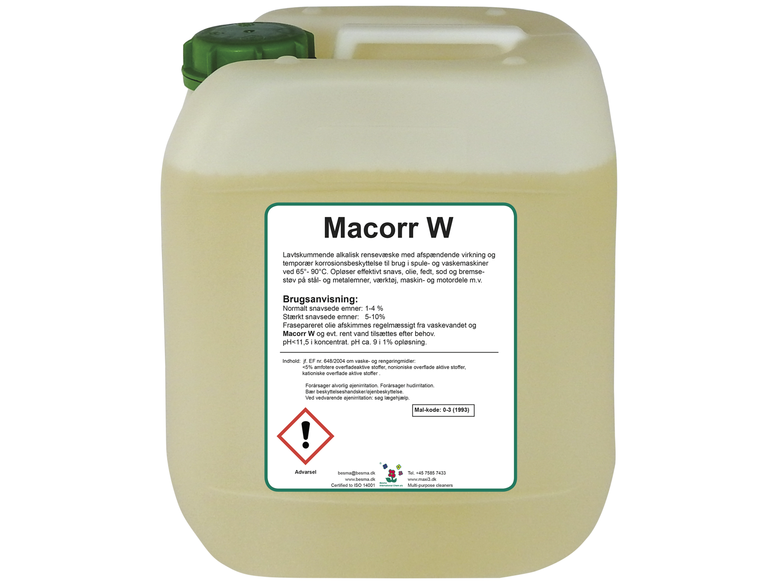 Macorr W er en lavtskummende alkalisk rensevæske med forstærket korrosionsbeskyttende egenskaber til brug i spule- og vaskemaskiner (65°-90°C). Rensevæsken opløser effektivt snavs, olie, fedt, sod og bremsestøv på stål- og metalemner, værktøj, maskin- og motordele mv. Specielt velegnet til emner af støbegods. Rensevæsken har en afspændende effekt og god separationsevne. Biologisk nedbrydeligt. pH-værdi koncentreret < 11,4 og pH-værdi i 1 % opløsning ca. 9.