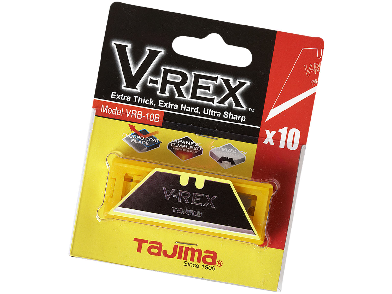 Tajima VR102D kniv eller trapezblade. Kniven er med håndtag udført i blåt, sprøjtelakeret aluminium. Ved at dreje håndskruen åbnes grebet, som indeholder 3 trapezblade. Klingen skydes frem ved top-betjent knap. Leveres på SB-ophæng i 12 stks salgsdisplay. Passer til alle trapez- og krogblade.