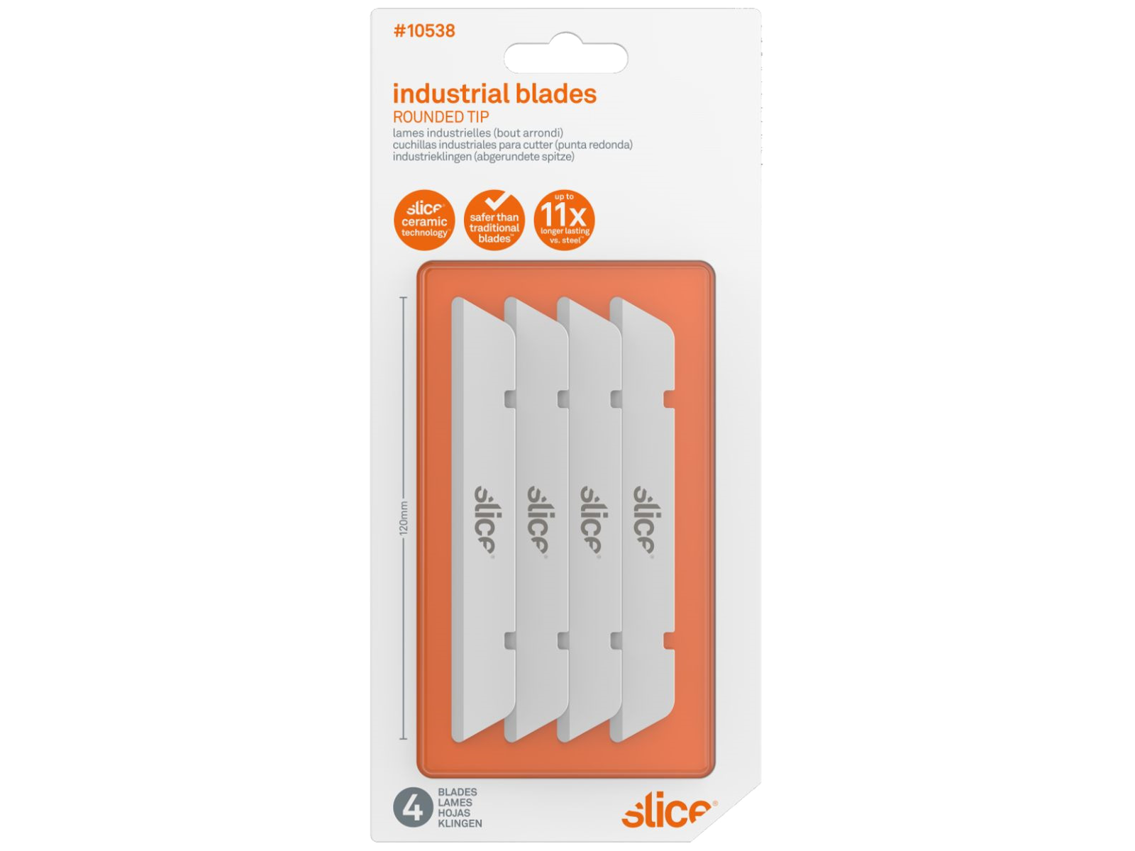 Pakke med fire lange knivblade med rundet spids. Denne model reducerer antallet af skader og sænker udgifterne.