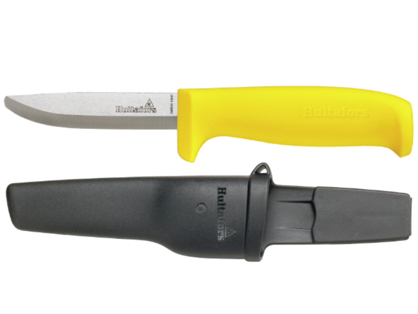 Sikkerhedskniv udformet med afrundet spids, udviklet og tilpasset for at minimere stikskader. Unik funktion, som sikrer, at skeden ikke løsner sig fra knappen i arbejdstøjet, og som samtidig er nem at fjerne. Knivbladet er fremstillet i japansk knivstål, 3 mm kulstål hærdet til 58-60 HRC. Æggen er slebet i flere faser med en afsluttende polering på læderskive. Skaftet og skeden er fremstillet i ekstra slagfast PP plast.