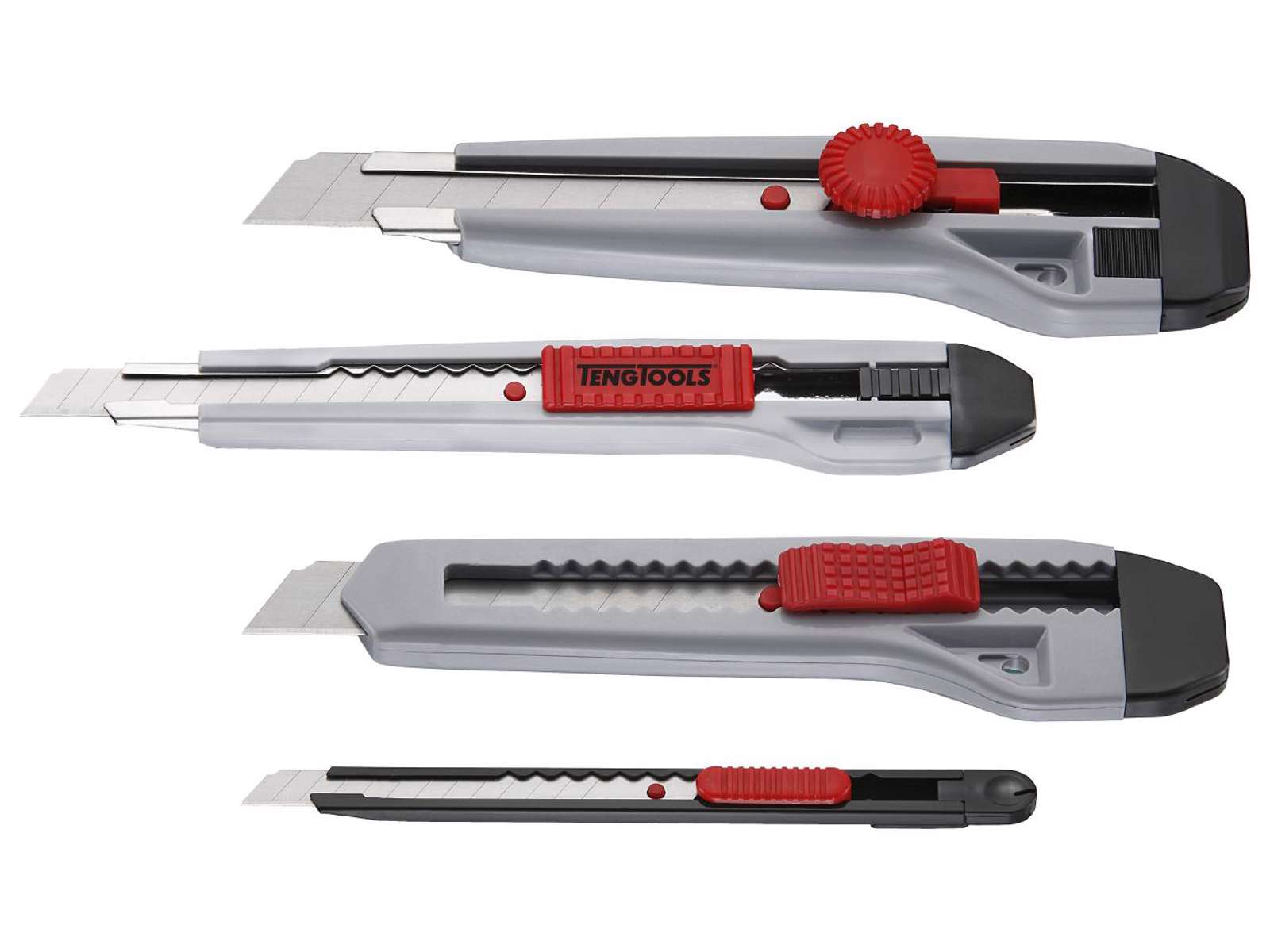 Knivsæt med 4 dele indeholdende 2 forskellige 9 mm knækbladsknive og 2 forskellige 18 mm knækbladsknive.