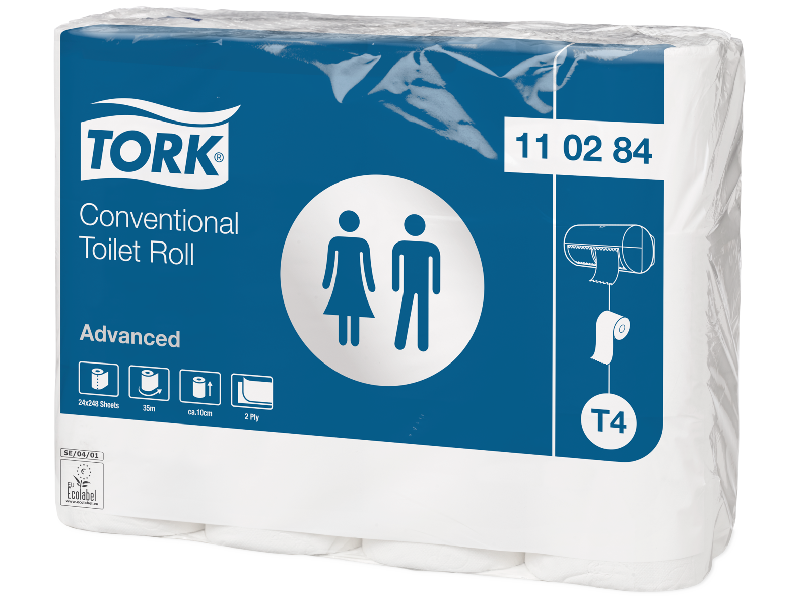Advanced 2-lags toiletpapir med elegant design med dekorativ prægning der giver fylde. Tork Easy Handling gør det let at bære, åbne og bortskaffe emballagen. Standard-rulle til traditionelle holdere og/eller T4-system.