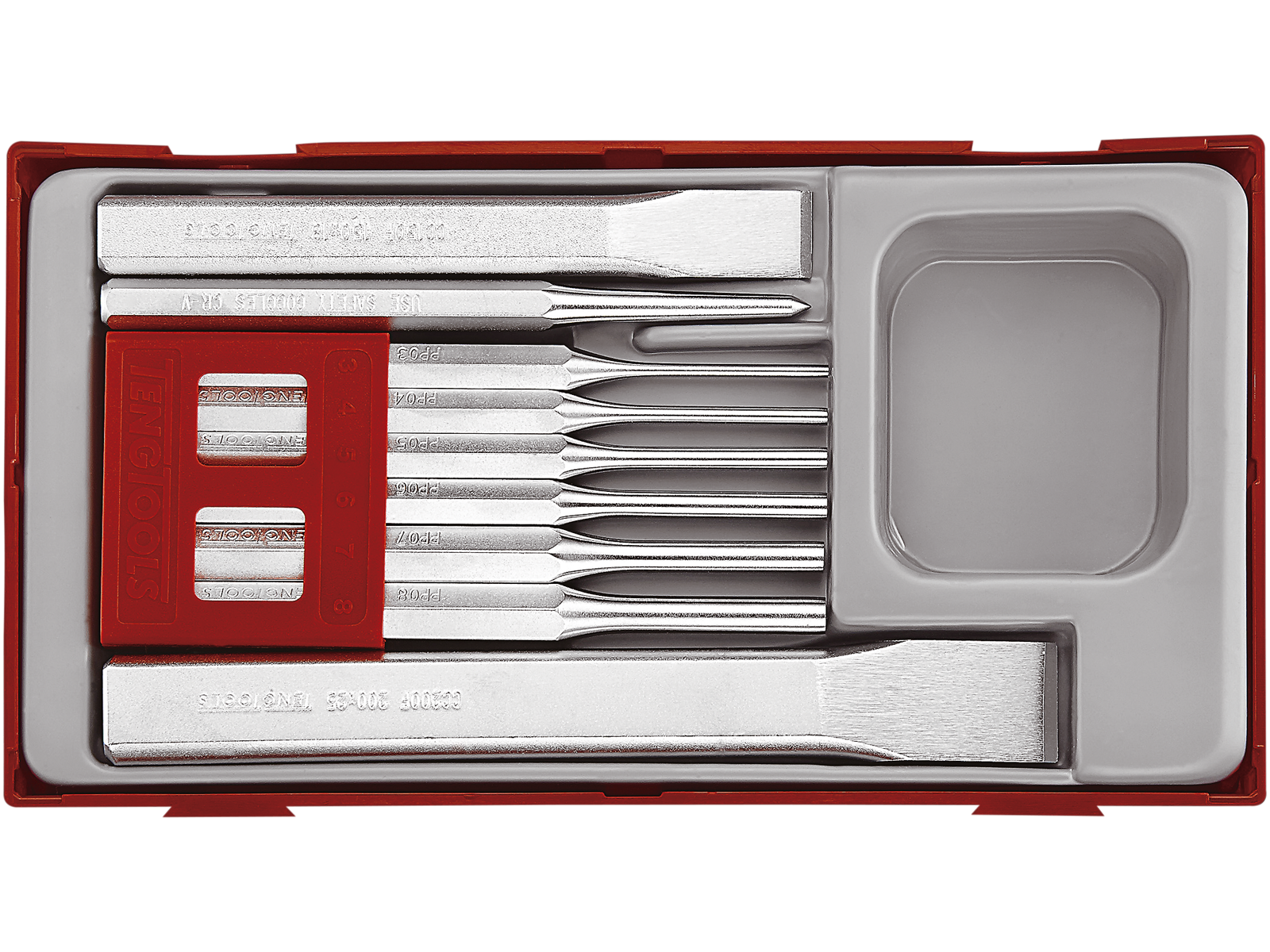 Kombineret sæt indeholdende 9 dele – 6 stk. drivdorne, 2 stk. hugmejsler og en kørner.