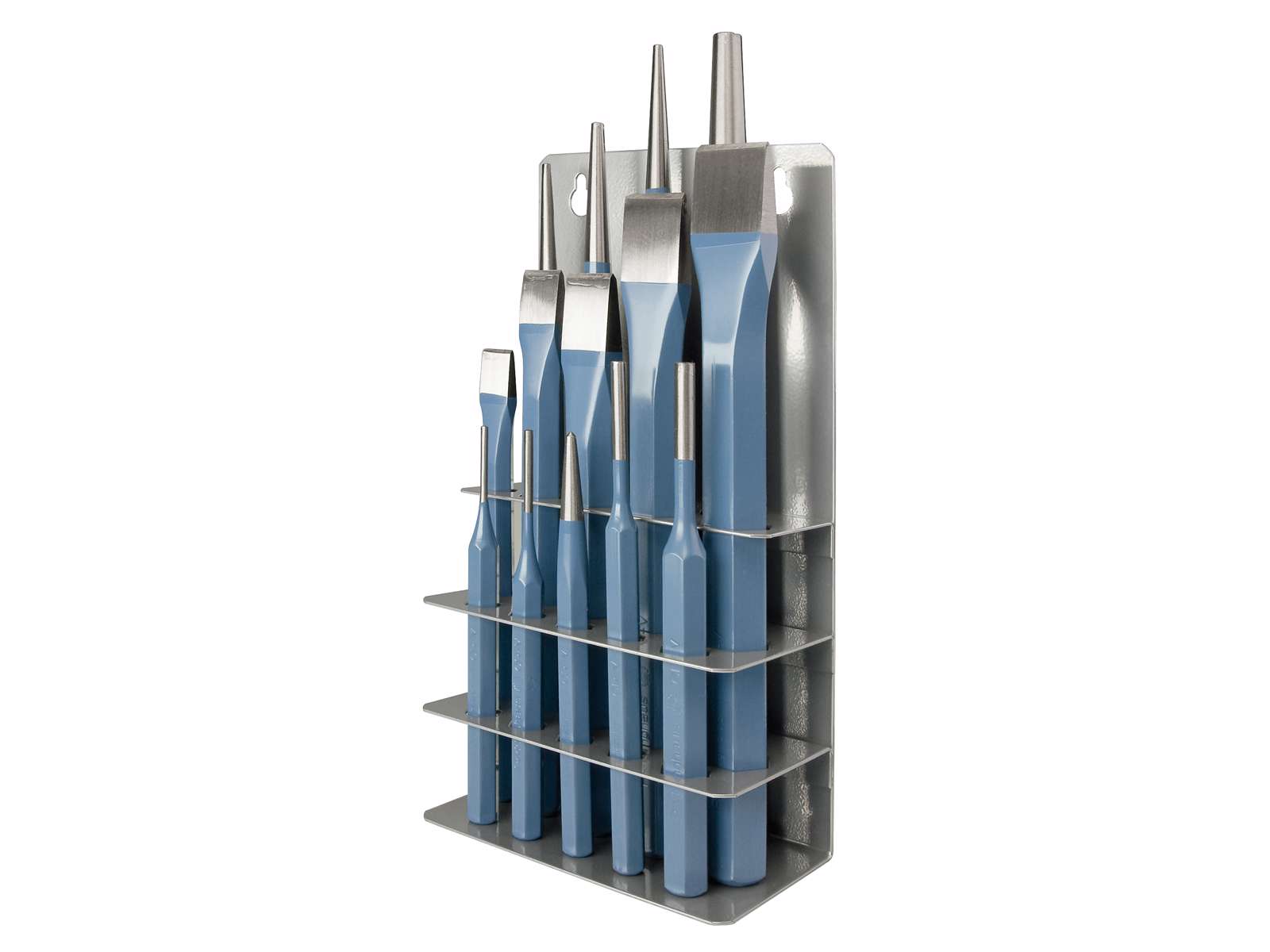 Mejsel, kørner, splituddriver og dornsæt i Chrom-Vanadium-stål med polerede spidser. Leveres inklusive kraftig metalstander som kan stå eller hænge. Indeholder 1×kørner: 3×125 mm, 4×splituddriver: 2 / 3 / 5 / 6 mm, 4×dorn: 3×215 + 3×250 / 4×225 / 10×250 mm og 5×fladmejsel: 13×150 / 16×175 mm.